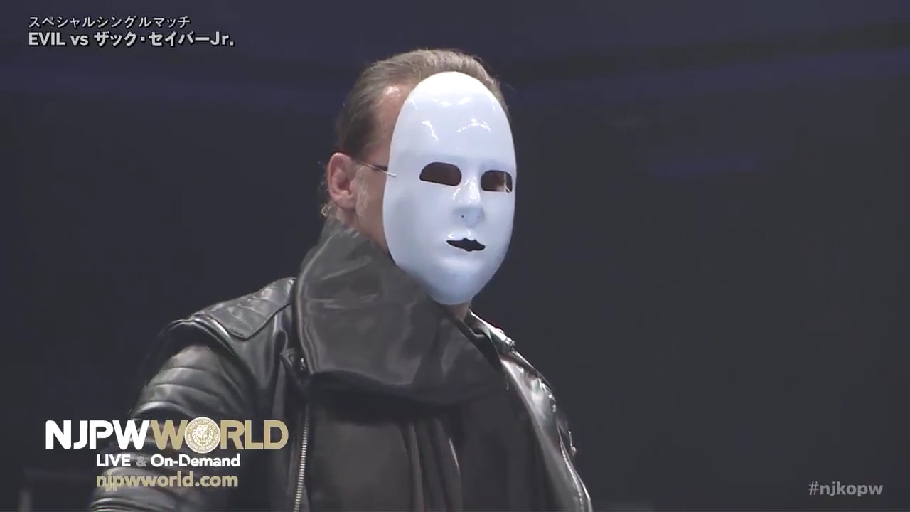Jericho attacked EVIL, who was scheduled to face Zack Sabre Jr. Jericho dressed up as one of EVIL’s masked druids and attacked him during his entrance, pounding on him, then giving him a codebreaker, then unmasking himself, then hitting him with the title belt.