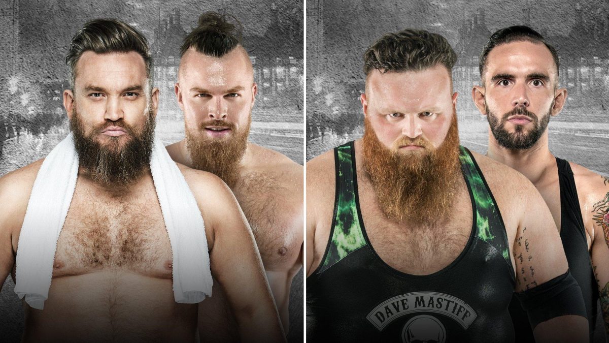 The Coffey Brothers and Wolfgang have been at war with Moustache Mountain for weeks, and the bad blood intensified when Gallus carried out a vicious backstage assault that allowed them to punish Trent Seven’s knee under a utility box.