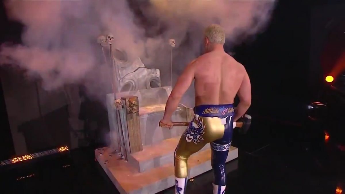 As Cody entered for his match against Dustin Rhodes, there was a throne set up in the entranceway with skulls and Triple H’s “logo” on it. Cody walked to the ring, then Brandi Rhodes grabbed a sledgehammer and handed it to him. He then walked back down the ramp and smashed the throne with the sledgehammer…