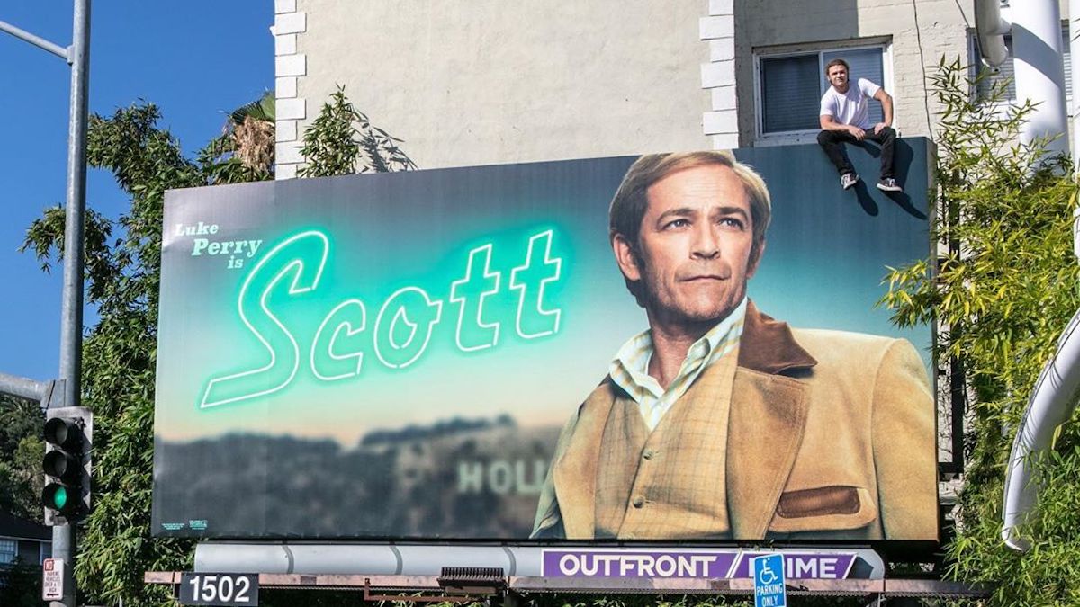 The billboard, which is on Sunset Blvd. in Los Angeles, features Luke Perry in the role of “Scott” in the upcoming Quentin Tarantino movie, Once Upon a Time in Hollywood.