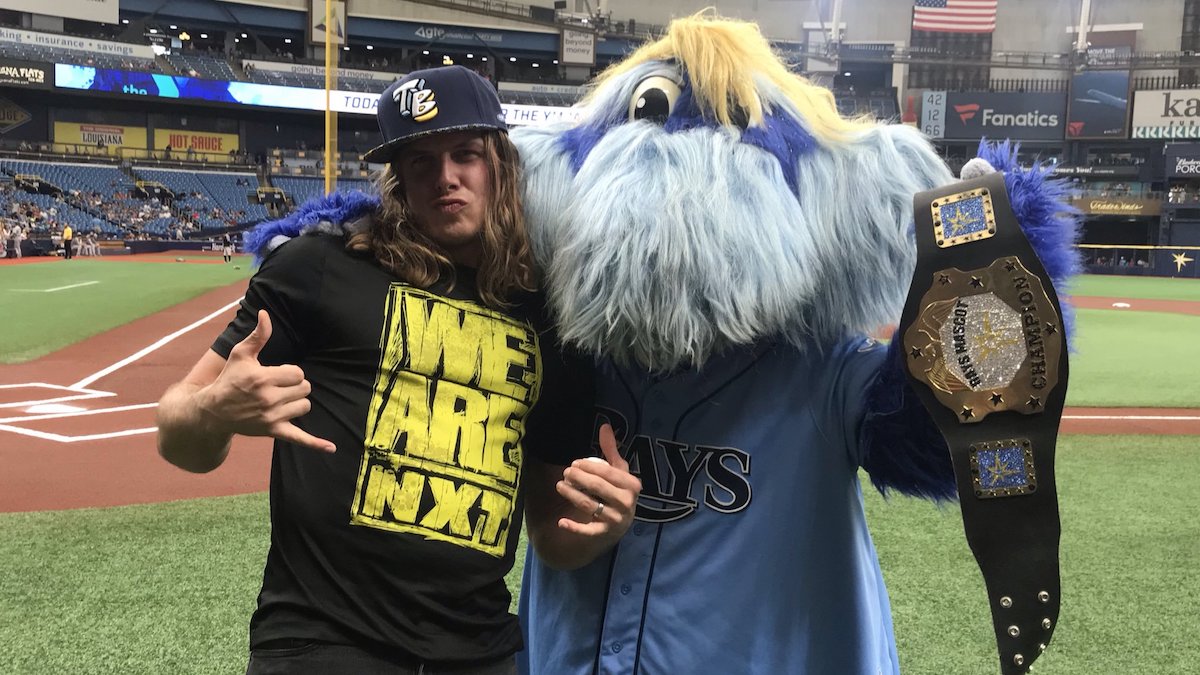 Matt Riddle threw out the first pitch at today’s Marlins vs. Rays game in Tampa, then hit a crossbody on the Rays mascot, Raymond.
