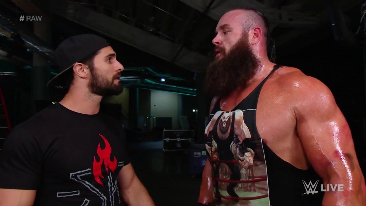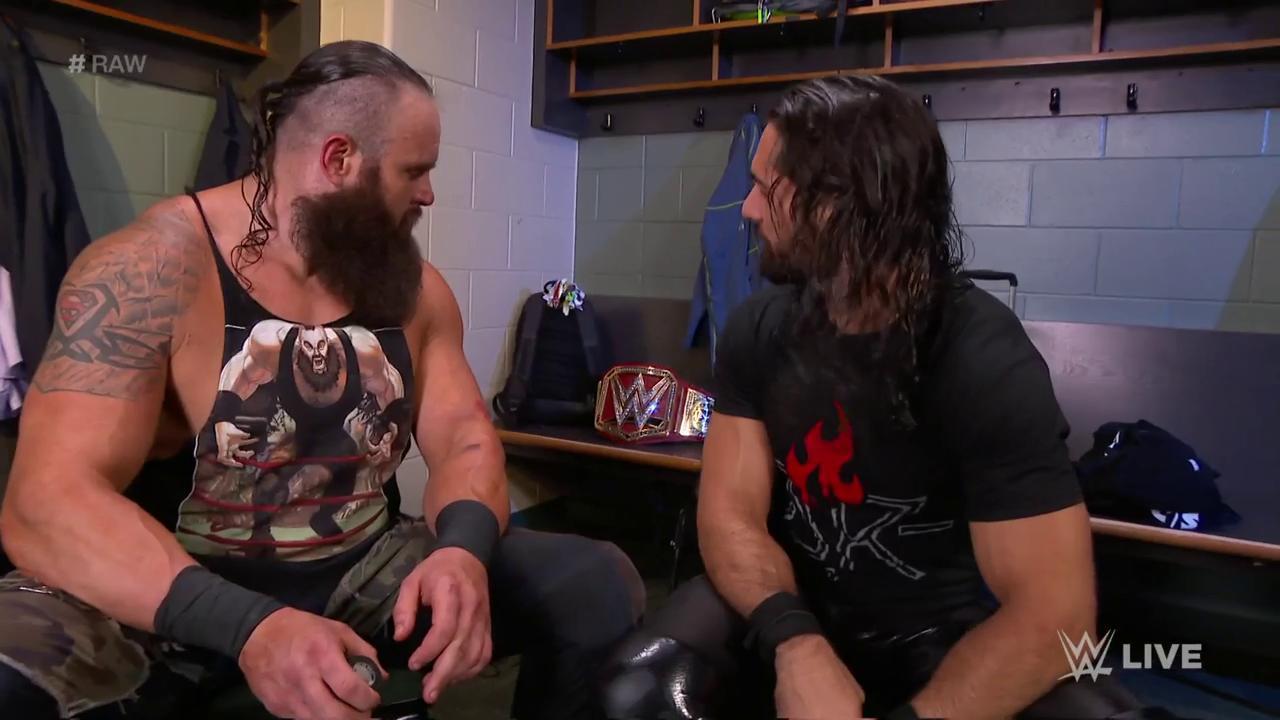 Seth Rollins is talking with Braun Strowman backstage. Strowman is distracted by looking at the WWE Universal Championship. Rollins tells him to stay focused and follow his lead. Strowman says he is focused, but Rollins needs to follow his lead so they become RAW Tag Team Champions.