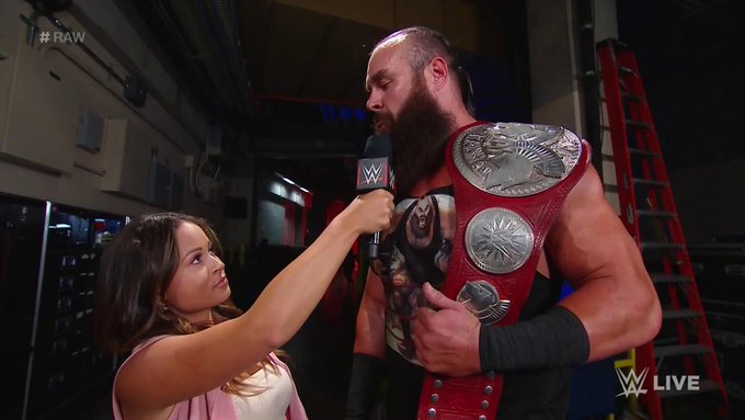We see a video that says it was from last week, but the graphic is incorrect. RAW Tag Team Champions Seth Rollins and Braun Strowman are backstage with Sarah Schreiber. Rollins says they’re on top of the world and take on all comers. Strowman is simply staring at the WWE Universal Championship. Rollins says he can tell that Strowman has his mind on other things. Strowman wants to know who Rollins is going to let challenge for the Universal Championship. Rollins asks if Strowman is challenging him for the title. Strowman says they just won the RAW Tag Team Championships last week… of course he’s challenging him for the title. Rollins says he won’t like it, but he doesn’t back down from a fight. Rollins says, “Challenge accepted. You’re on… partner.”
