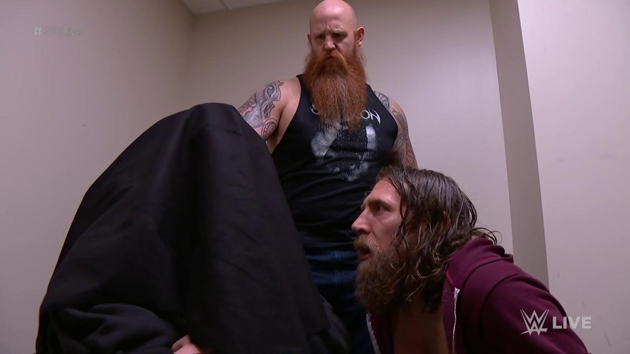 Daniel Bryan and Rowan are backstage. They have someone who is wearing all black and they are covering the person’s face. Bryan says he knows what he did and everyone knows what he did. They sit the person down and tell him not to move.