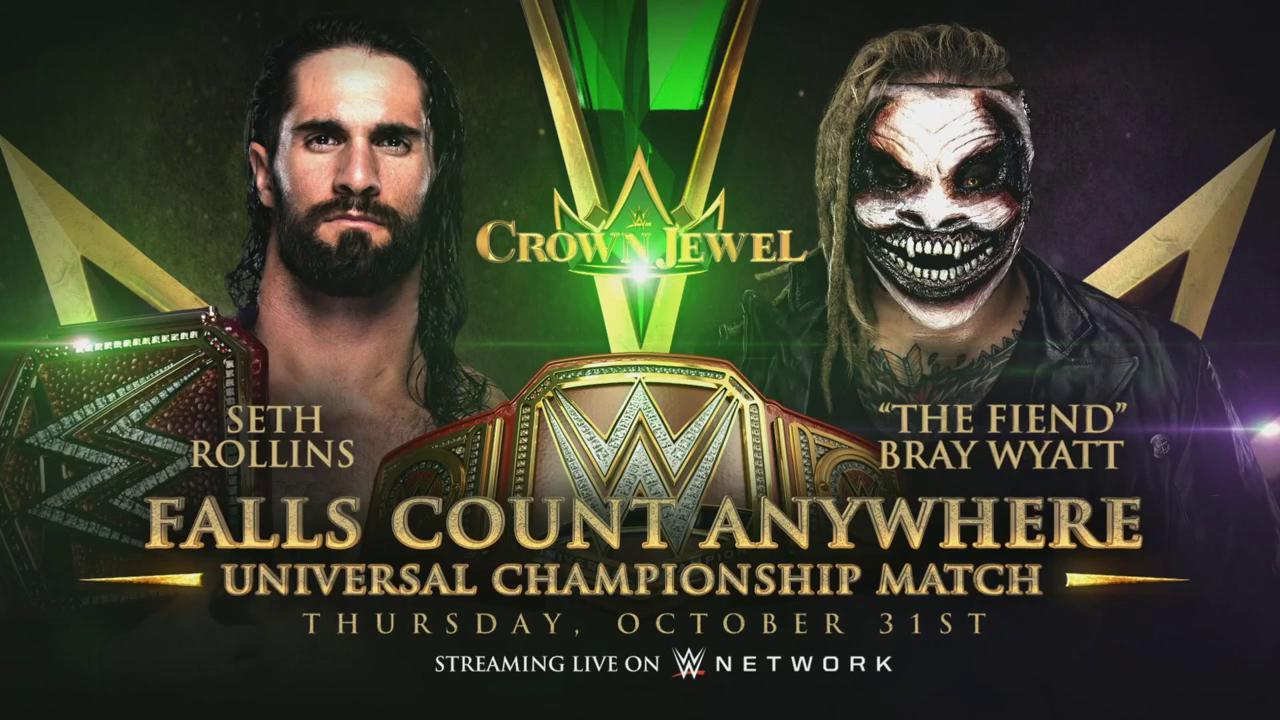 Seth Rollins vs. Bray Wyatt in a Falls Count Anywhere Universal Championship match is announced for Crown Jewel.