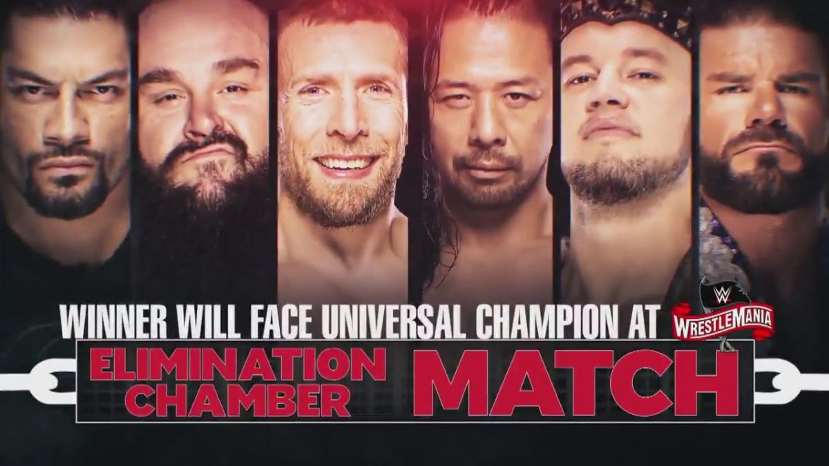 March 8th at Wells Fargo Center: Roman Reigns, Braun Strowman, Daniel Bryan, Shinsuke Nakamura, King Corbin & Robert Roode will compete in an Elimination Chamber Match with the winner earning a chance to face the Universal Champion at WrestleMania!