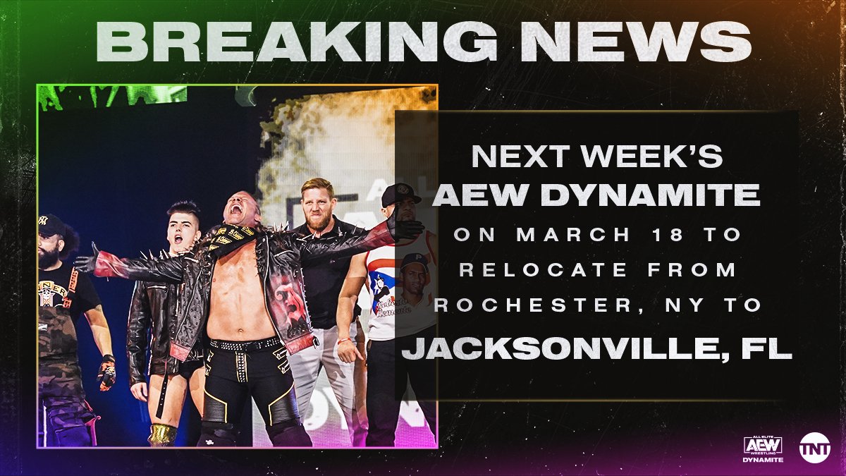 As a precautionary measure against COVID-19, we are relocating next week’s AEW DYNAMITE show on March 18 from Rochester, NY, to Jacksonville, FL.
