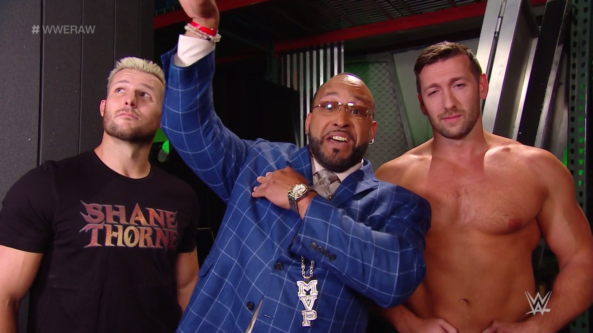 MVP appears on the screen and says he has a keen eye for talent. The NFL Draft got him thinking. It’s time to reintroduce a tag team to Raw. MVP is with Shane Thorne and Brendan Vink. MVP says Ricochet and Alexander got lucky last week. MVP says the rematch will be straight up BALLIN’.
