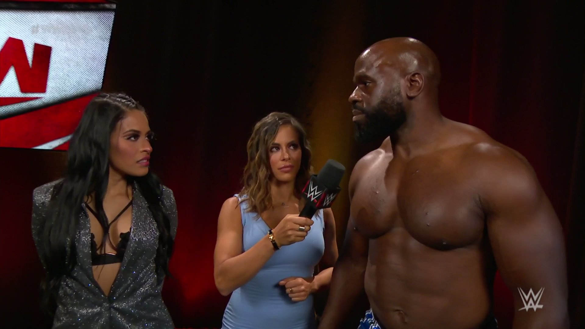Charly Caruso is backstage with Bobby Lashley. MVP walks up and says he and Lashley will not be doing business together because he’s dealing with clowns like R-Truth and his wife, Lana. Lashley looks insulted. MVP says he saw what he did to R-Truth. What if he locked the full nelson on the WWE Champion? We’ll never know. It’s been 13 years since he’s had a shot. Lashley doesn’t need the WWE Championship. He has other trophies… like his trophy wife. MVP says he’s not trying to cause trouble.