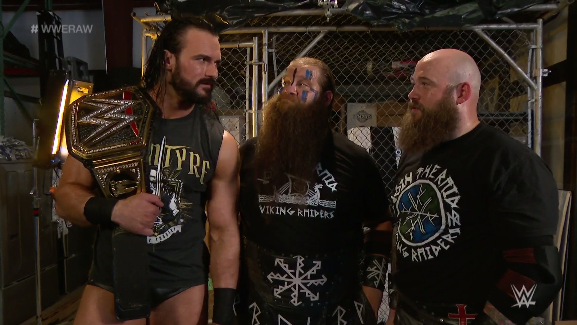 The Viking Raiders are talking backstage when WWE Champion Drew McIntyre comes up to them. McIntyre says he wants to celebrate with them after they beat MVP and Lashley. McIntyre has turkey legs.