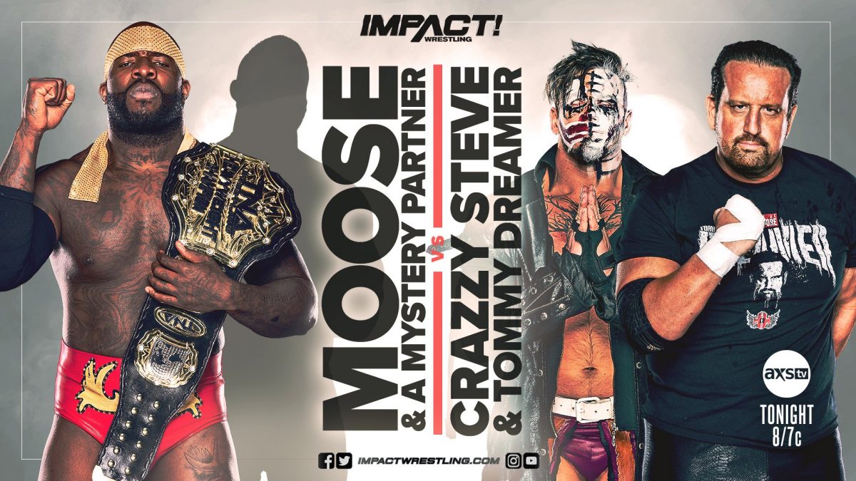 Before Dreamer challenges Moose for the TNA World Heavyweight Championship this Saturday at Slammiversary, they meet in tag team action. Moose sends Steve flying across the ring with a Fallaway Slam. Moose charges into the corner but Steve sidesteps him. Steve and Dreamer double team the self-proclaimed TNA World Heavyweight Champion. Dreamer dropkicks Steve into a crossbody to Moose. Dreamer is about to fly but Rohit cuts him off with a clothesline. Moose and Dreamer brawl outside the ring as Dreamer sends him into the steel ring post. Steve hits Rohit with a top rope DDT to win.