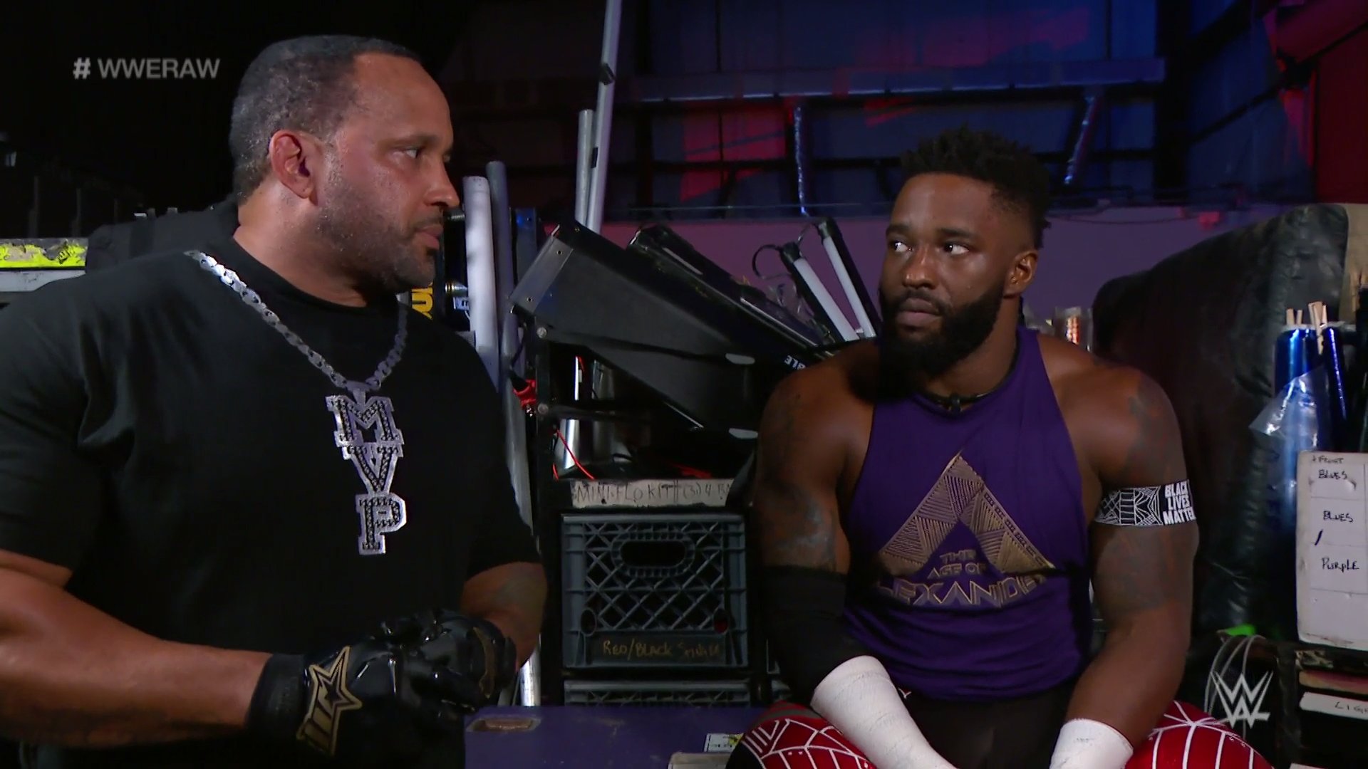 Cedric Alexander is sadly sitting backstage when MVP walks up. MVP says he knows how Alexander is feeling. When he was backstage, he wanted to be out here. The difference here is his friends didn’t hold him back like what is happening to Alexander. Maybe Apollo Crews was concerned about him… or he thought Alexander was the weak link. MVP says he made an offer a little while ago and it still stands. MVP tells him to think about it. MVP walks off. Alexander goes to say something, but stops himself. Alexander takes a sip of water and angrily slams it down.