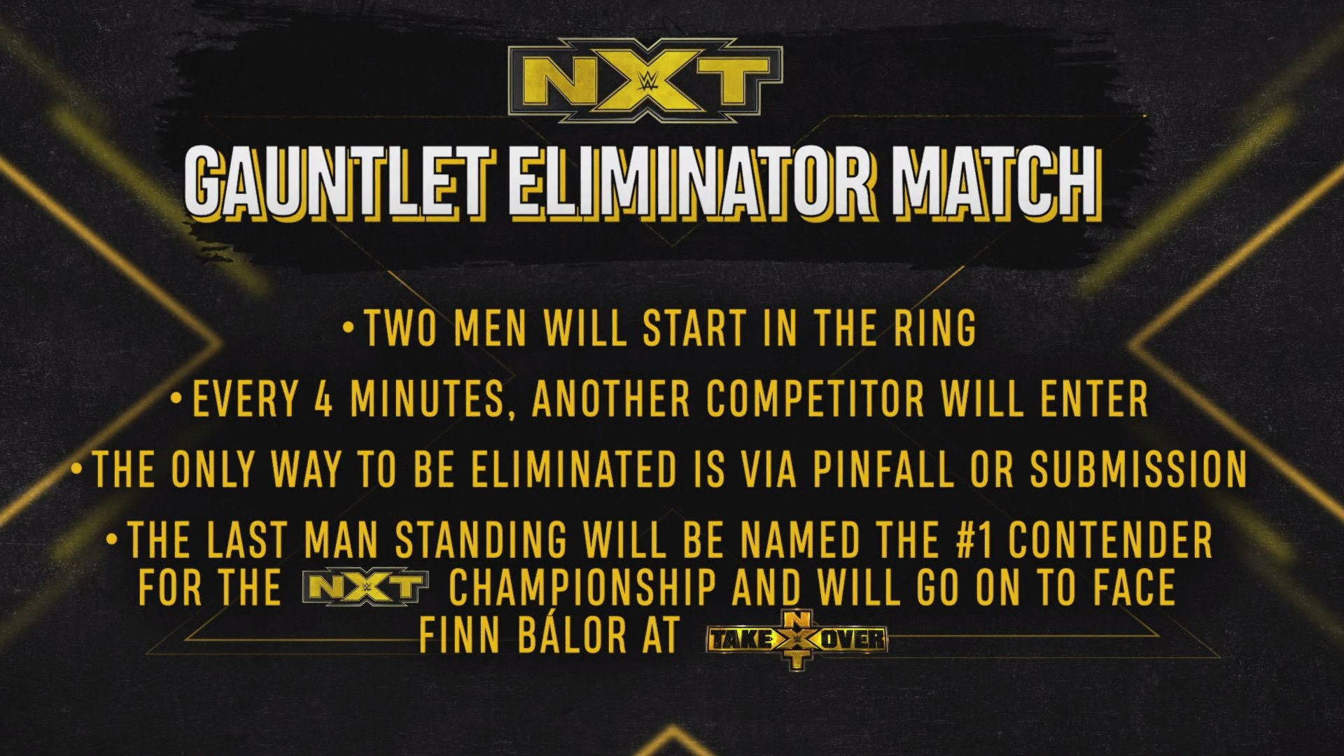 NXT General Manager William Regal says we need to determine a new #1 Contender for the NXT Championship. 5 Men will compete in a brand new match: the NXT Gauntlet Eliminator Match. Two men will start in the ring. Every 4 minutes, another competitor will enter. You can only be eliminated by pinfall or submission. The last man standing will be the #1 Contender for the NXT Championship and fight for the title at NXT TakeOver on October 4.