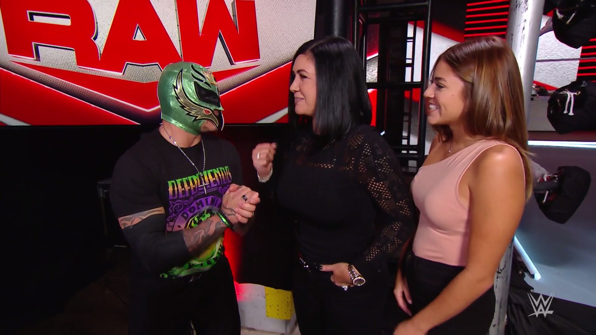 Footage is shown of Aalyah checking on Murphy before getting in the ring last week on Raw. Rollins asks if that’s really his daughter. That doesn’t seem like something a Mysterio would do. She was consoling his disciple, Murphy. What was going on? Aalyah… what was going on there, Rollins asks. Rey says they already spoke about it, but he raised his daughter to be caring and compassionate, something Rollins knows nothing about. Rey tells Rollins to keep his daughter’s name out of his mouth. She’s just 19-years-old. She’s naive and knows nothing about their world. Aalyah looks insulted and walks off on him. Angie, Rey’s wife, goes after her. Rey and Dominik look confused. Rey walks away, and Dominik angrily stares at Rollins before going to the back.