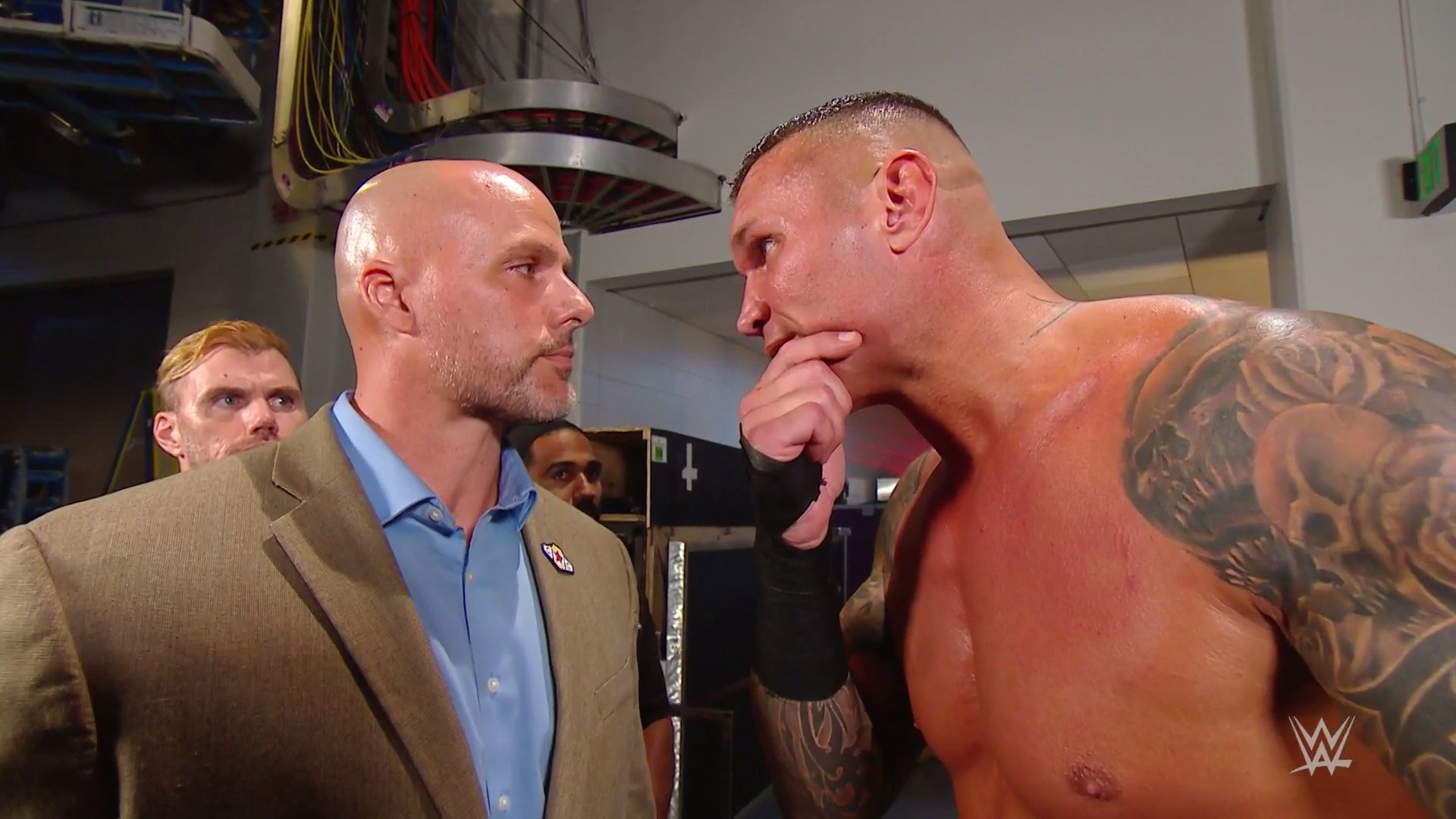 Randy Orton is backstage holding his jaw. Adam Pearce is apologizing to him. Orton says he couldn’t do his job and his word is worthless to him.