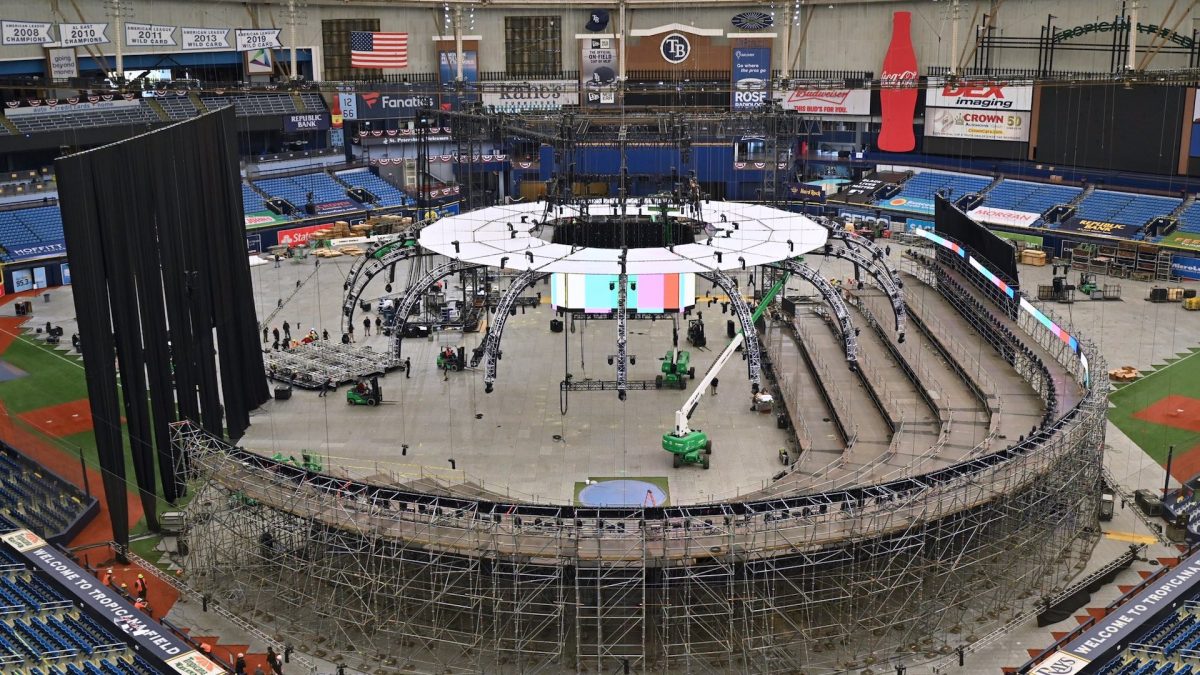 Source passed along video from inside Tropicana Field of the new #WWE ThunderDome. Shows you the true scale of it inside the Trop. #Rays @BN9 pic.twitter.com/HwyXyOH4d0