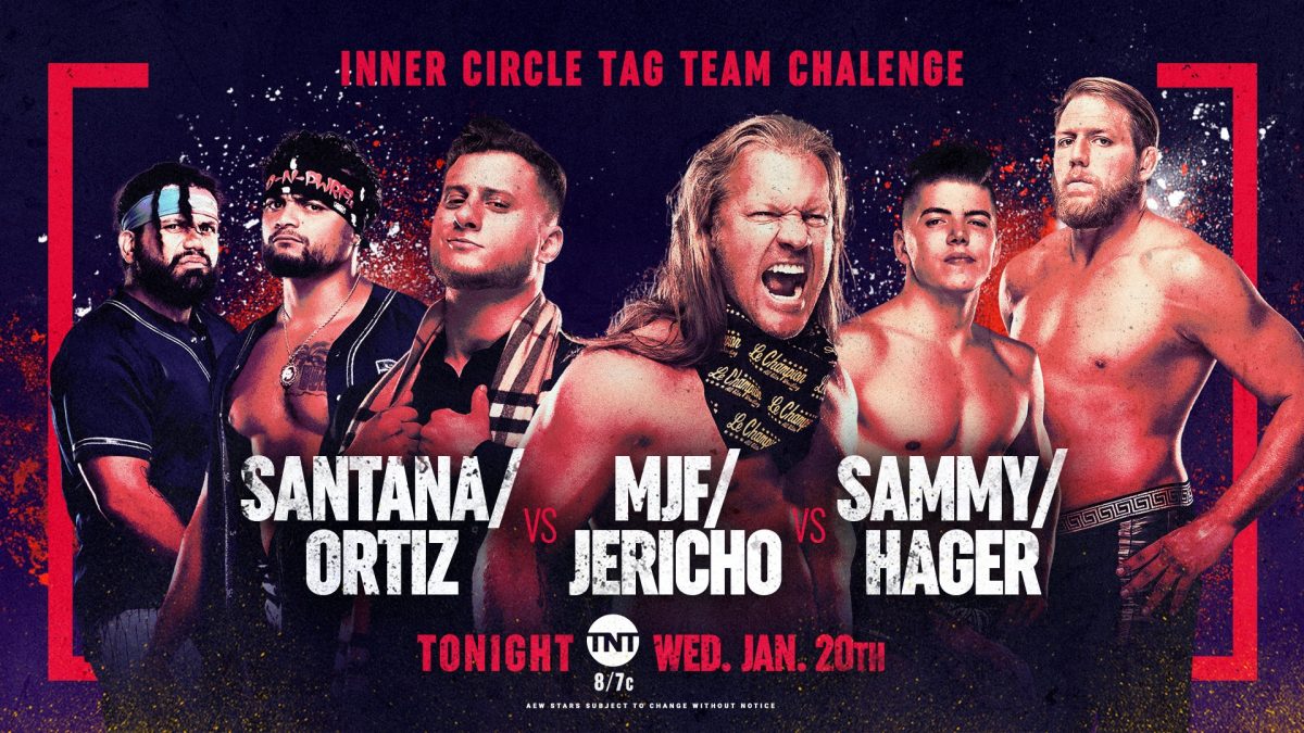 - Inner Circle Tag Team Challenge Three Way Tag Match: Chris Jericho & MJF defeated Sammy Guevara & Jake Hager and Santana & Ortiz via rollup with a handful of tights by MJF on Guevara