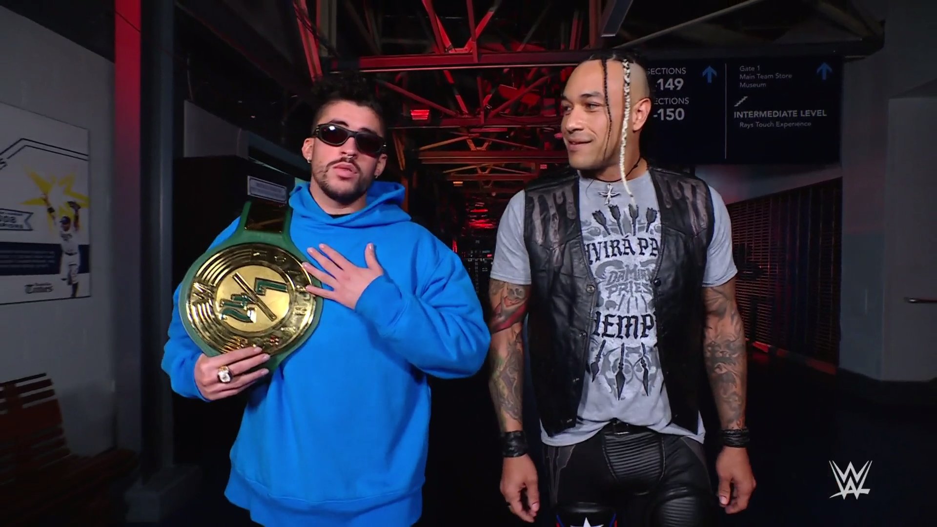 Damian Priest is walking backstage with WWE 24/7 Champion Bad Bunny.