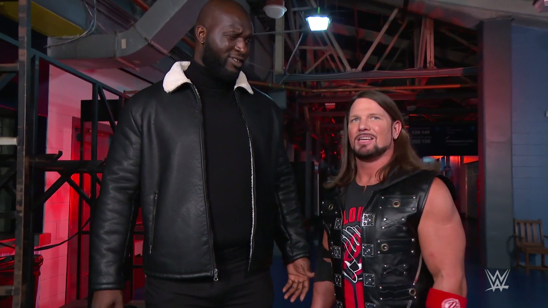 Kingston says Styles doesn’t know Omos. Kingston asks what is Omos’ favorite color. Styles says it’s red, but Omos says it’s mauve. Styles thinks his favorite ice cream is vanilla bean, but Omos likes peanut butter caramel. They ask who Omos’ favorite WWE Superstar is. Styles says it’s got to be him. Omos says his favorite is André the Giant. How can they be a team if Styles doesn’t know Omos likes mauve. Styles tells Kingston to get in the ring so he can kick his butt because AJ rocks.