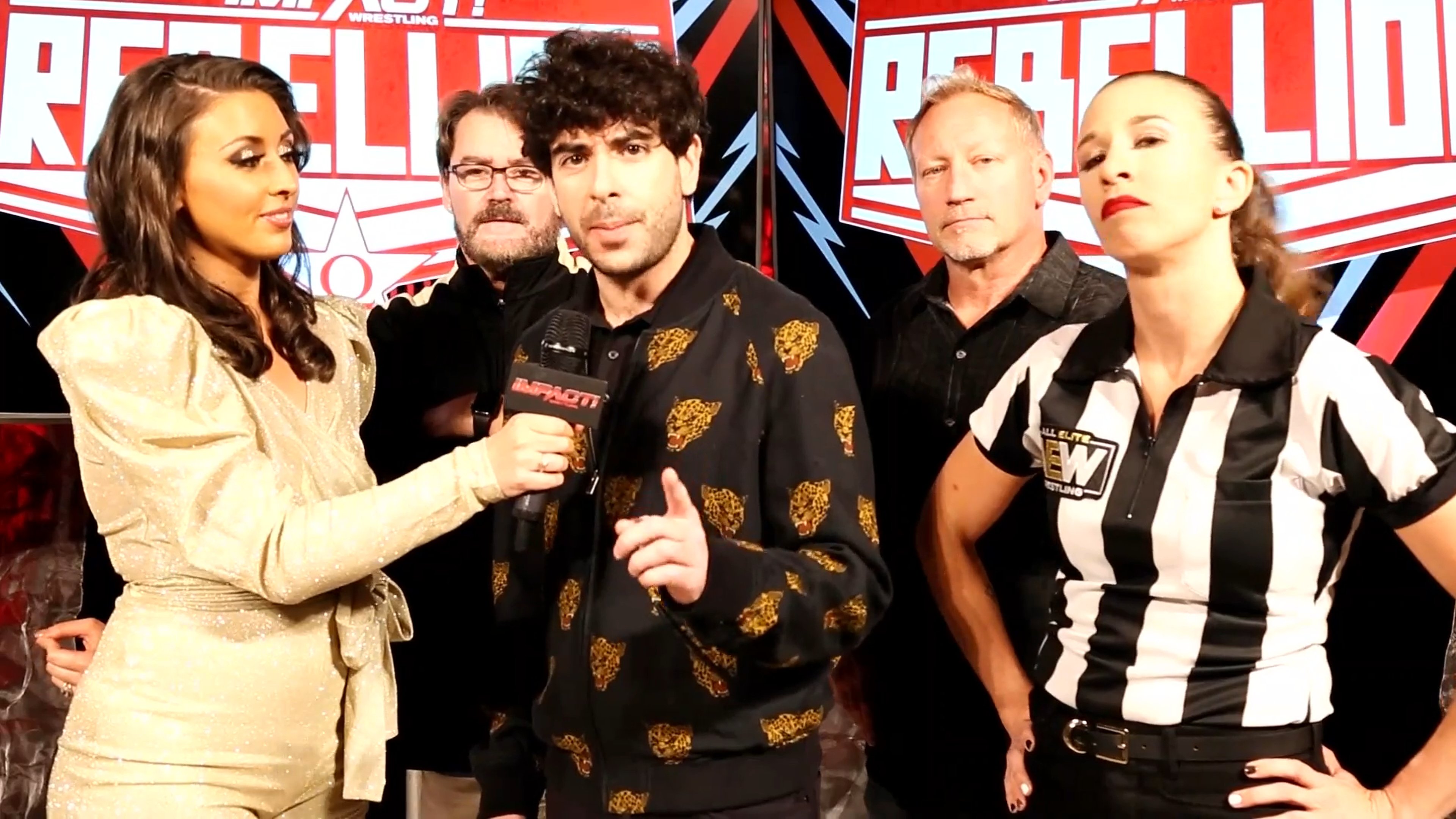 Gia Miller interviews AEW owner Tony Khan, alongside Tony Schiavone, Jerry Lynn and Aubrey Edwards. Khan introduces Aubrey Edwards as tonight’s referee for the Title vs. Title match between IMPACT World Champion Rich Swann and AEW World Champion Kenny Omega. IMPACT Executive Vice President Scott D’Amore interrupts with IMPACT referee Brian Hebner by his side. D’Amore tells Khan that tonight, there will be two referees in the main event.