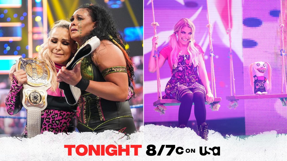 Alexa Bliss is on her swing set holding Lilly. WWE Women’s Tag Team Champions Natalya and Tamina are there. Natalya says it was great winning the titles. It’s Tamina’s first title in WWE. Tamina asks if they can go, but Bliss says she hasn’t even asked the tough questions yet. Bliss asks what their favorite color is. Natalya looks confused and says she likes pink. Tamina says black and blue, which will look good on Bliss’ face if she tries anything weird. Bliss says that wasn’t very nice. Lilly liked when she beat up Reginald a few weeks ago. Tamina says she’ll do it again if he gets involved in their rematch. Bliss starts talking, but Natalya and Tamina walk off. Bliss says they’ll be watching tonight.