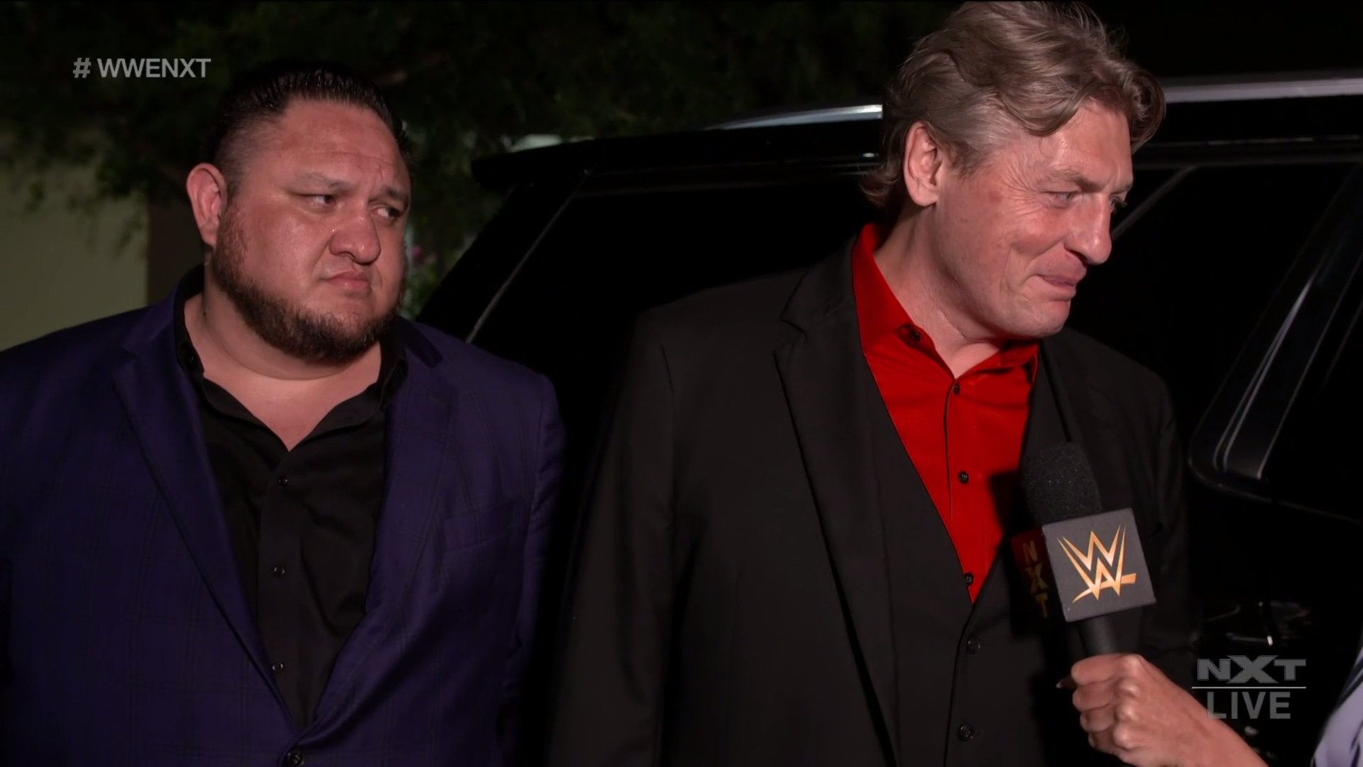We hear the horn and out comes Samoa Joe in a purple suit to a loud “Joe Joe Joe Joe!” chant. Joe gets in the ring and stands beside Regal, staring down the NXT Champion. Joe speaks. “Mister Regal, I believe you wanted to speak with me.” Regal says, “I did Joe, but not in these circumstances. It was a talk for later but you’re here and…because of my love for NXT, I think everybody deserves a General Manager that can hold the position with the integrity and respect that it deserves. So I would like for you to be the new General Manager of NXT.” The crowd goes wild. Regal starts to state that he’s unable to perform his duties when Joe interrupts him. “My answer is absolutely…(no).” Joe goes on to praise Regal’s tenure in NXT, praising him for scouring the world for the best talent–Joe himself included. Joe tells Regal that over the last seven years, Regal’s taken NXT from obscurity to an international phenomenon. The crowd chants loudly. Joe tells Regal that Regal’s got shoes too-big for him to feel, but he wants to make an offer. Joe admits he always made Regal’s life hell when he was there, but he always afforded Regal suspect. “With that being said, I’d be more than happy to see that you get the respect you deserve from everybody,” he says right in Karrion Kross’ face. Regal confesses it’s an interesting idea, and says if he’s willing to do it there are certain conditions: “Number one, you cannot be a competitor. Number two, you cannot lay a hand on anyone…” He pauses and looks at Kross, finishing “…unless provoked.” Joe accepts his offer and says there’s only one more question to be answered, “which is: what are you still doing in this ring?” He gets right in Kross’ face and says “tick tock, young champion” as the crowd pops for Joe. The crowd starts a “Joe is gonna kill you” chant as Kross and Scarlett leave. The crowd then starts a “nah nah nah nah, hey hey hey” lyric chant and we head to break.