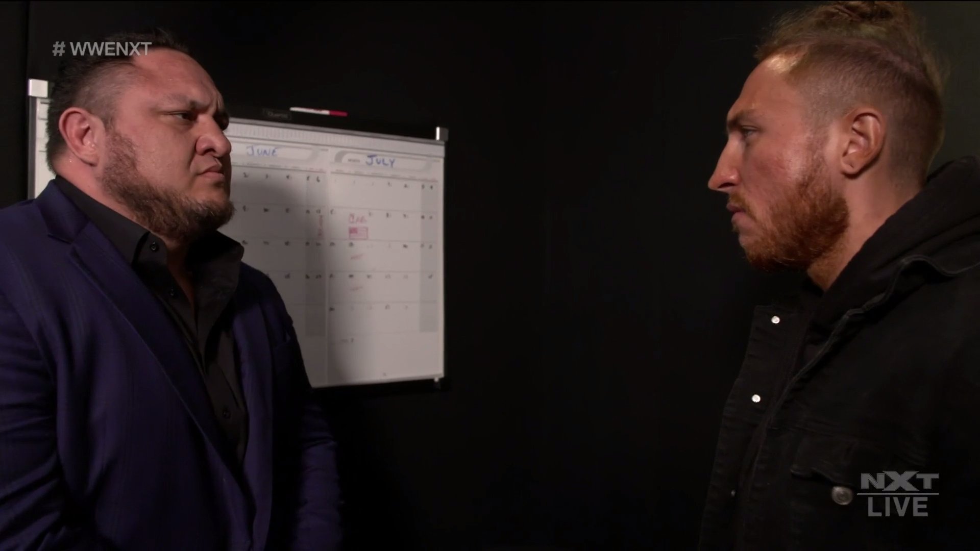 Mackenzie wants to talk to Joe and Regal but they’re rudely interrupted by the Way. The Way come up, chanting “Joe Joe Joe Joe!” Joe tolerates them briefly before telling them to get the hell out of there. Pete Dunne shows up and stares Joe toe-to-toe to end the segment.
