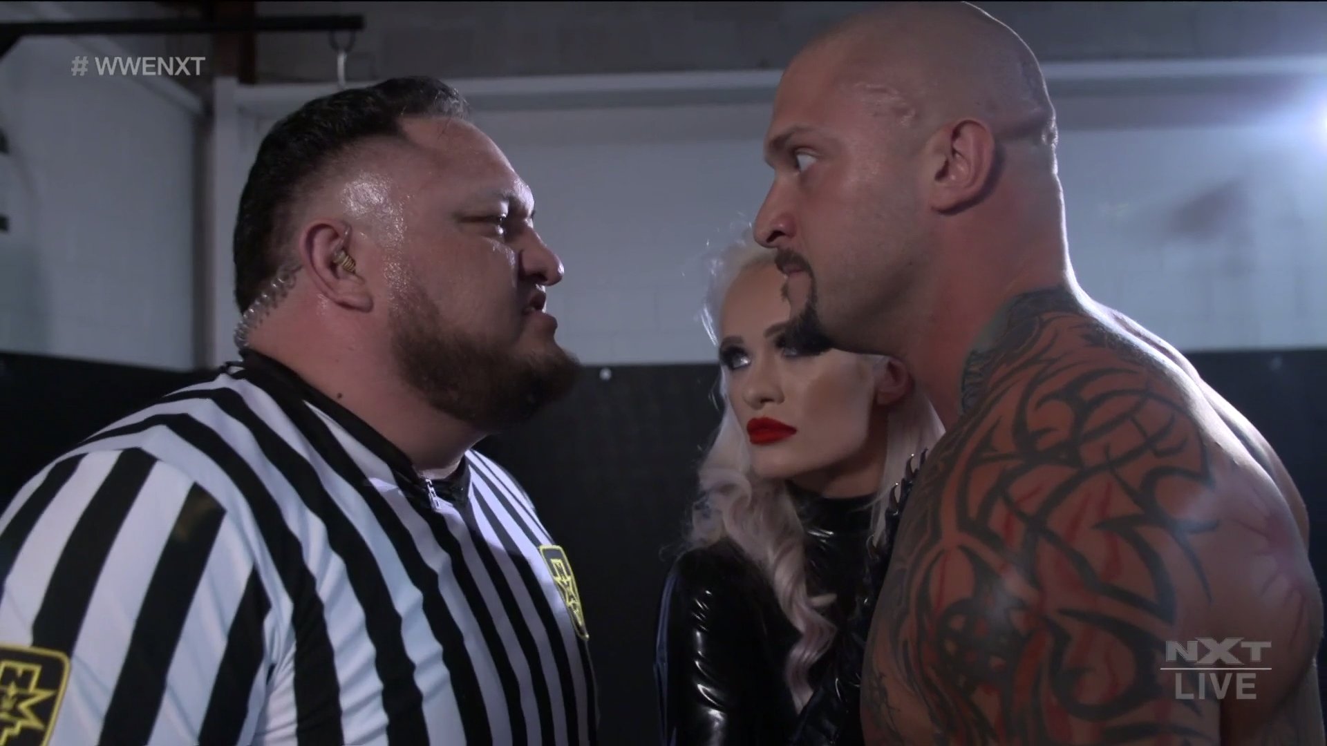 We see Samoa Joe in his referee shirt entering the locker room of Johnny Gargano to go over the pre-match stuff with him like he did with Karrion Kross earlier in the show. As he walks off he sees Pete Dunne, who stops and has a face off with him before we head to a commercial break.