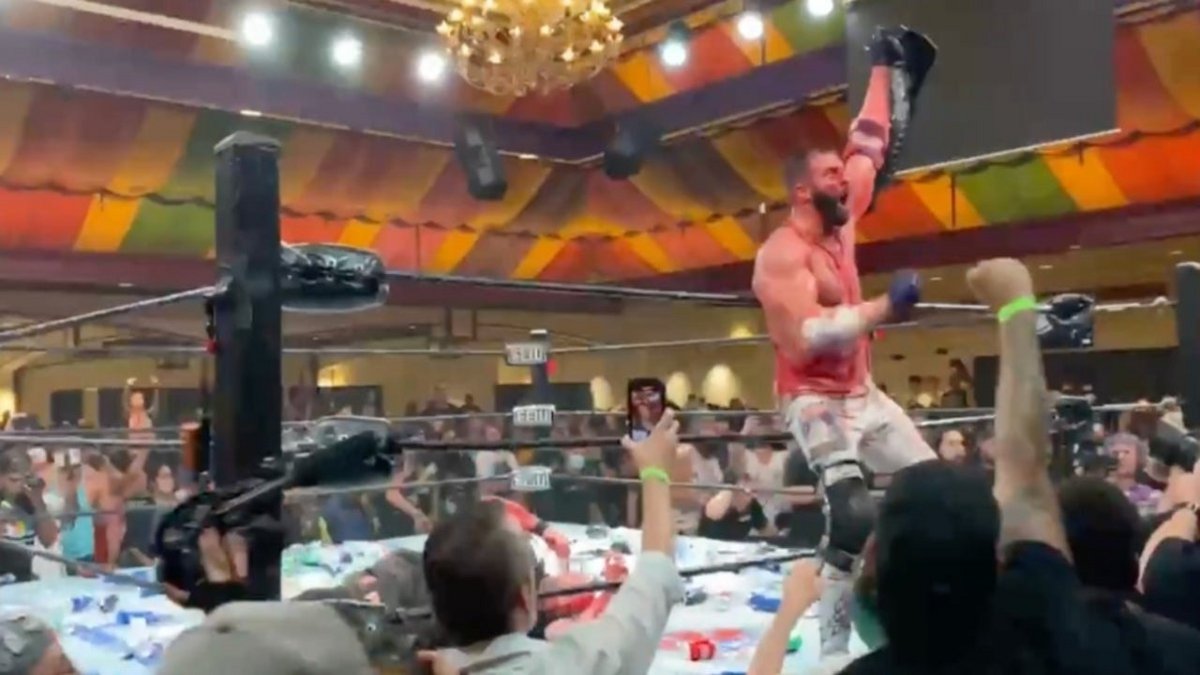 As noted before, Matt Cardona defeated Nick Gage to win the GCW World Championship at Game Changer Wrestling’s Homecoming 2021 Night 1 event this past Saturday. Following his win, the crowd at the event became very rowdy and tossed beverages into the ring at Cardona.