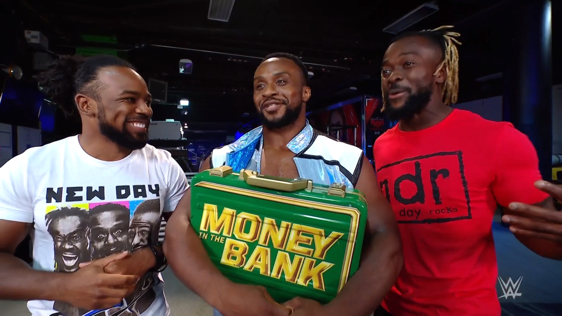 Big E is backstage when we see Xavier Woods and Kofi Kingston surrounding him and smiling. They’re excited for him and dance around.