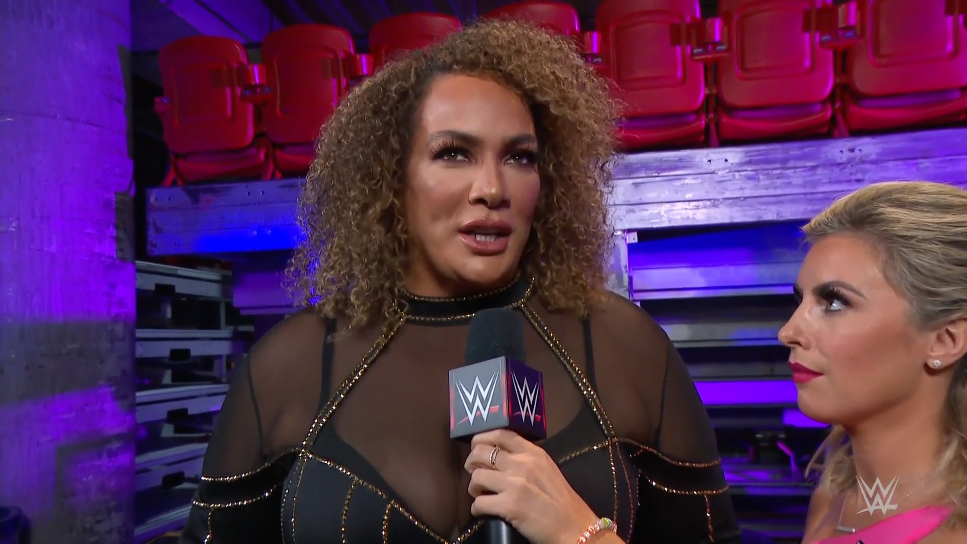 Sarah Schreiber asks Nia Jax for a response to Charlotte Flair. Jax says everything Flair said was a defense mechanism. No one has physically overpowered her as Jax did. She did splatter Flair. Now Flair wants to bash her with the crown, but she can’t find it since she shoved it so far up her royal behind. Flair has no dignity and will have no title soon.