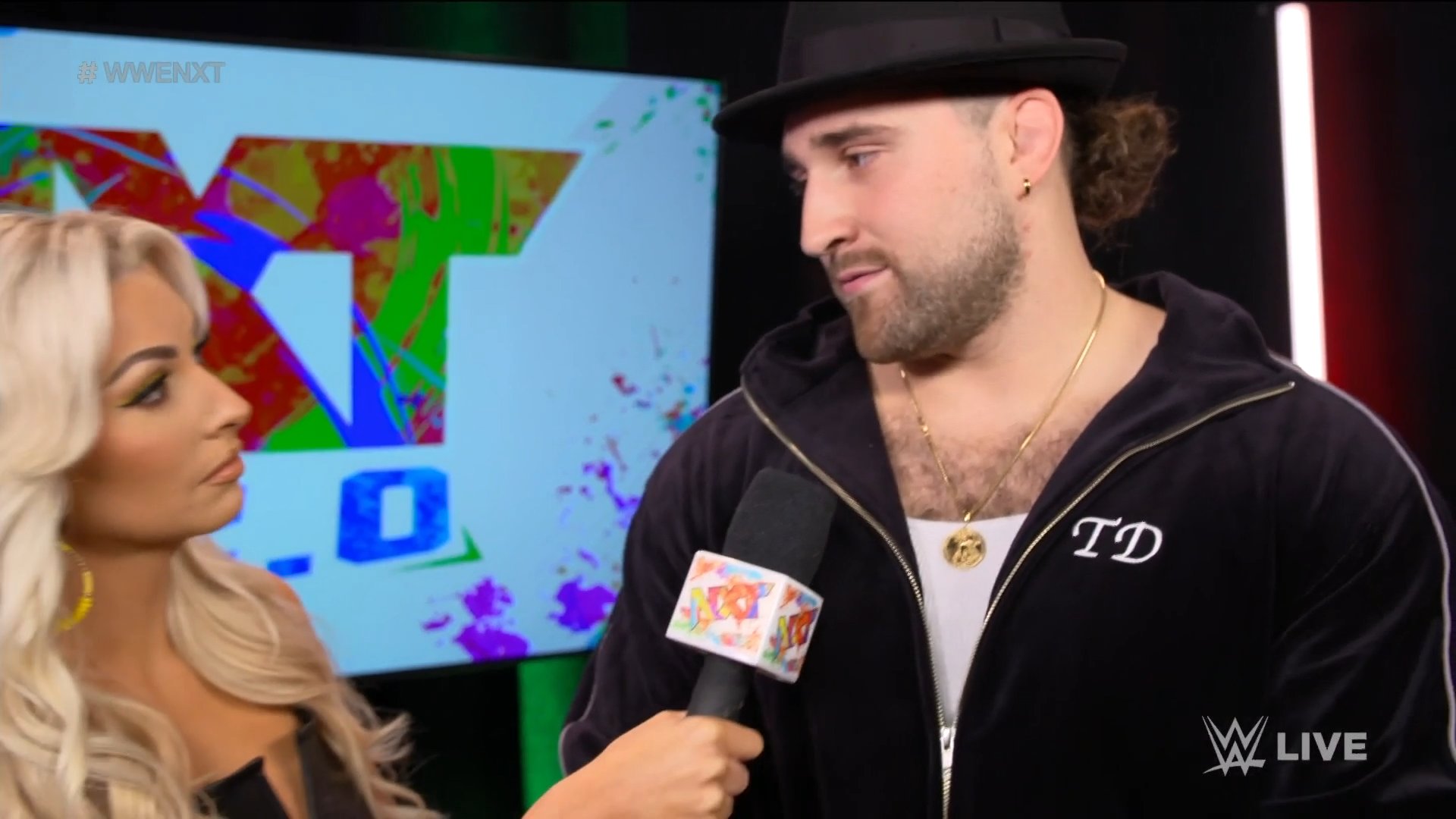 Duke Hudson speaks via the tron. He questions why Grimes is mad as last week, he took a lot of money from Hudson in their poker game and a free haircut. He states he was trying to make Grimes look more like a human being than a troll. He declines Grimes’ challenge. “Sorry but not sorry!” Grimes replies to Duke, telling him that he’s gutless and nutless. Grimes states he wants to go all in. “Duke Hudson, Cameron Grimes. NXT WarGames. Hair versus hair!” The crowd pops and Hudson accepts as he wouldn’t mind taking a little more off the top. “You’re on. And at WarGames? I’m going to take the rest.” He holds up a baggie holding Grimes’ hair that Hudson liberated last week.