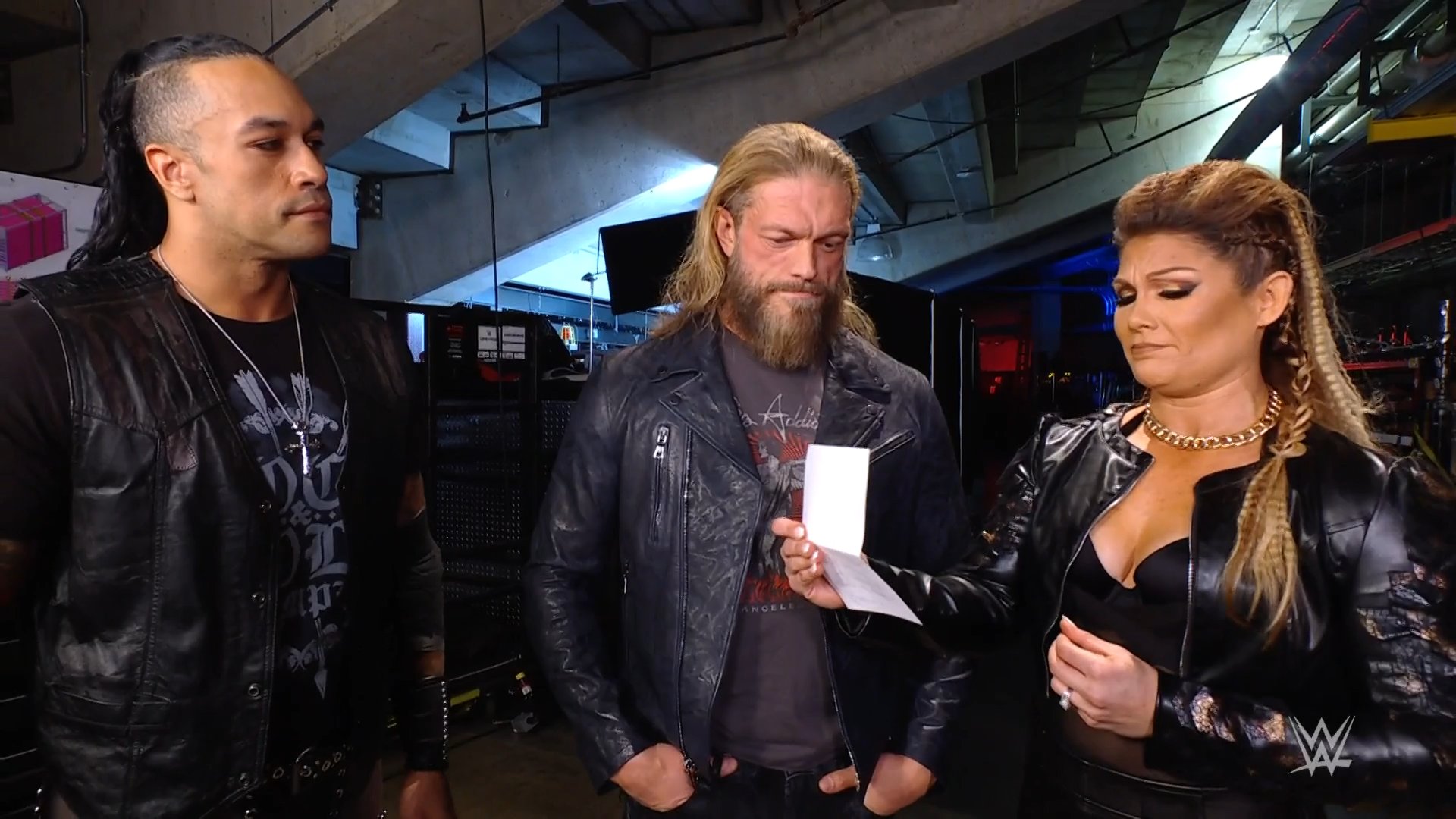 Edge and Beth Phoenix are backstage with Reggie and WWE 24/7 Champion Dana Brooke. Reggie asks for advice on facing Omos. Edge doesn’t think he has a chance but wishes him luck. Reggie walks off. Phoenix puts over Dana Brooke for busting her butt through the years. Brooke thanks her and runs off.
