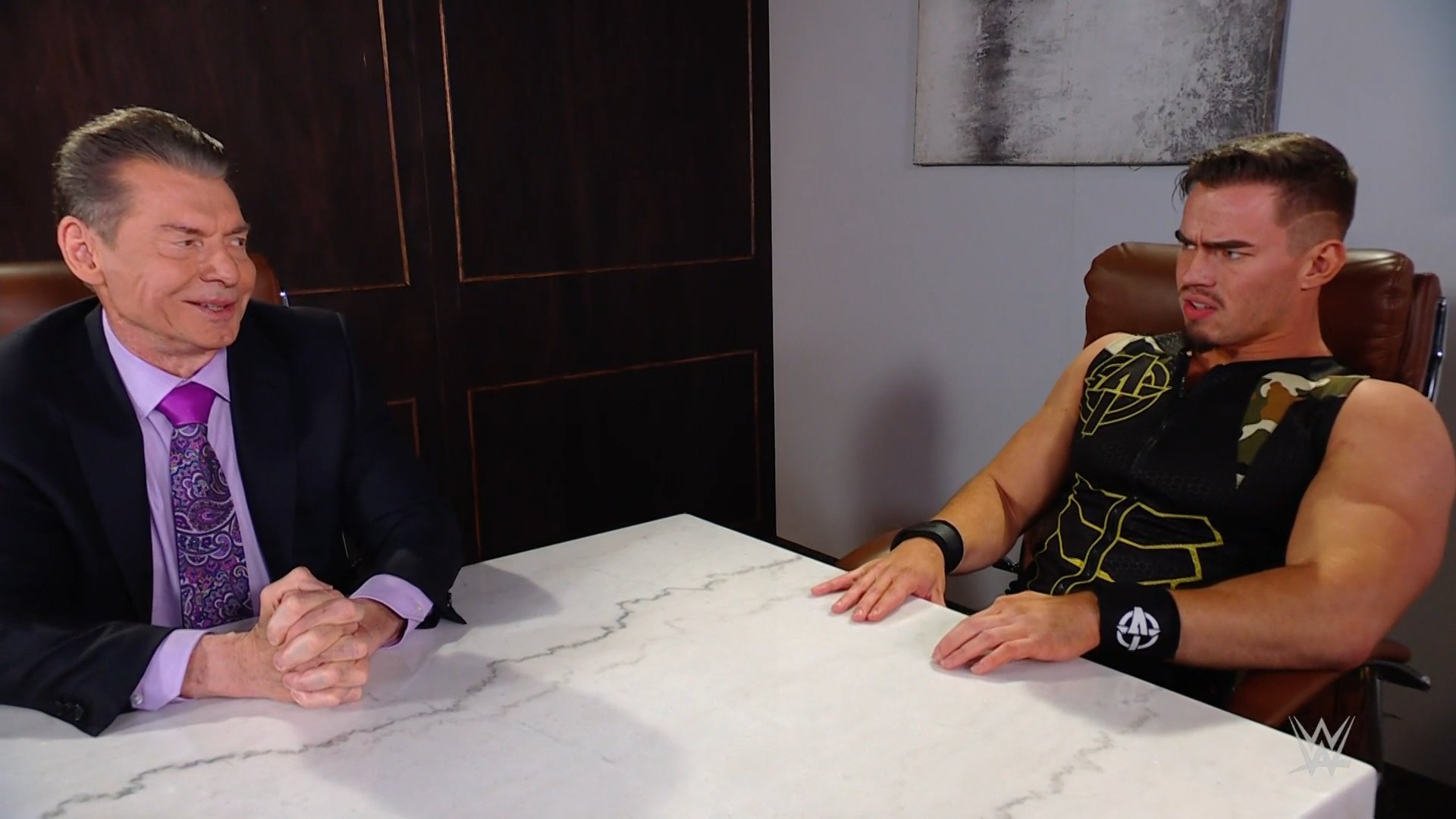 Footage is shown of Finn Bálor beating Austin Theory last month. Mr. McMahon is watching the match backstage. Austin Theory walks in and thanks him for the rematch. Theory says he beat Bálor and almost ended his career after the match, which is almost like a half-victory. McMahon says Theory better beat Bálor or he’ll beat Theory up. He’ll have Theory dragged back to his office and leave him in a pool of blood, sweat, and snot. Then McMahon will take a selfie with him. Theory looks worried.