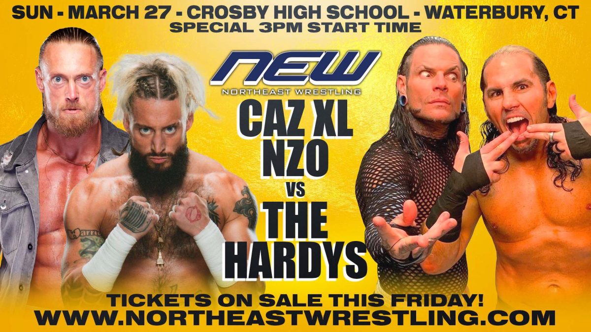 - March 27 for Northeast Wrestling in Waterbury, CT – The Hardy Boyz vs. NZO & Caz XL (Enzo & Cass)