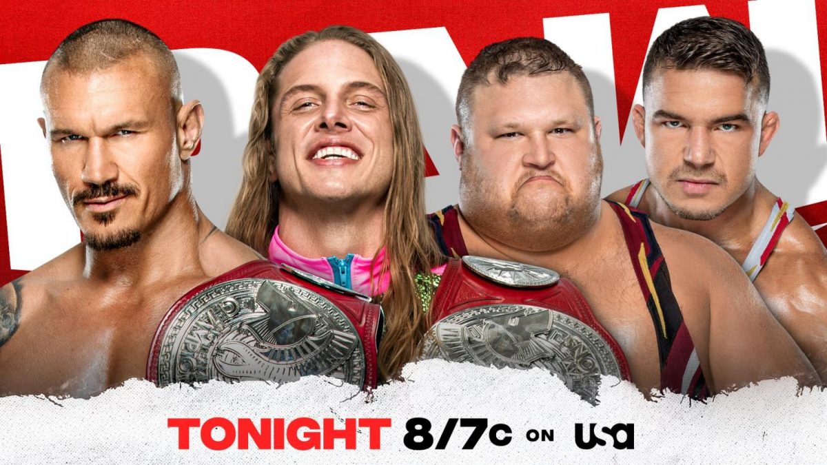 Chad Gable starts against Randy Orton. They lock up, and Gable wrenches the arm. Orton takes Gable down and tags Riddle in before flipping Riddle onto Gable. Gable fights back and tags Otis in. Otis attacks Riddle and tags Gable back in. Riddle fights back at Gable and hits an exploder. Riddle goes to the apron, but Gable sweeps his feet. Otis then crushes Riddle with a shoulder block at ringside.