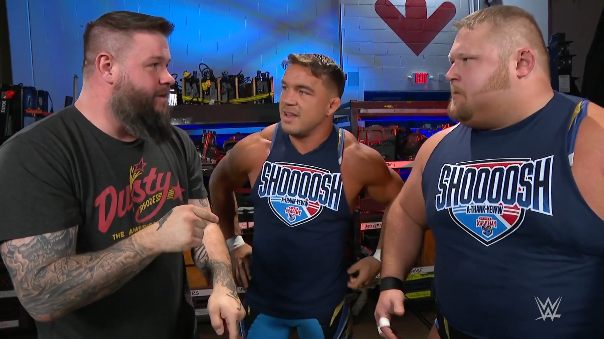 Kevin Owens is backstage talking with Alpha Academy. Owens says his brother, Ken Owens, is coming from Canada to beat the truth out of Ezekiel… no, Elias!