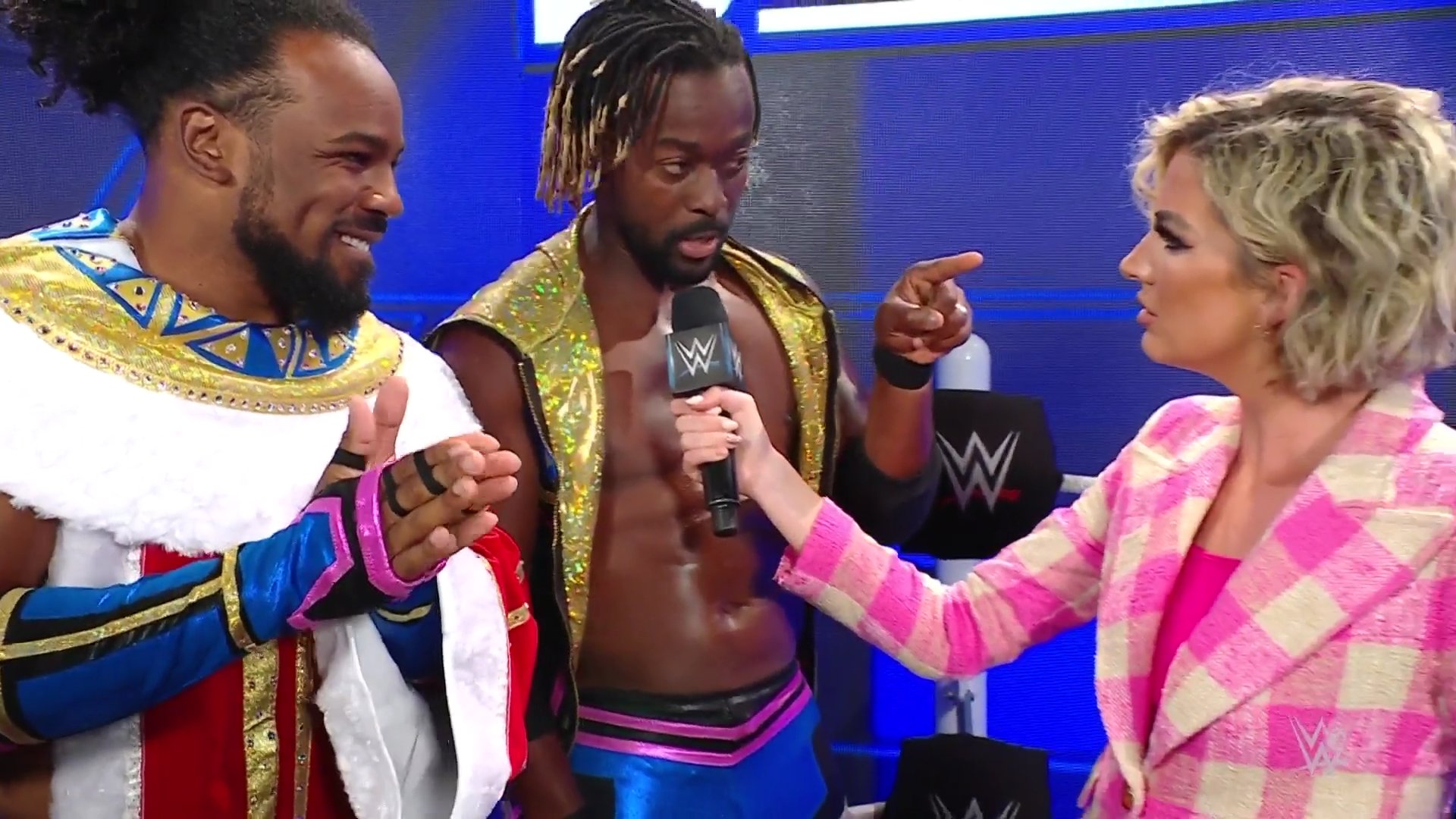 Megan is backstage with The New Day. She asks people want to know who their tag partner will be tonight. Kofi says does Netflix give away the ending to Stranger Things? WOods tells her people have been calling them all week wanting to be their partner. Woods says their partner can be anyone. Kofi says their partner can even be her.