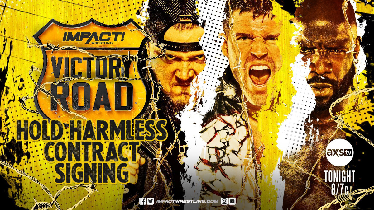 IMPACT Executive Vice President Scott D’Amore presides over the Hold Harmless Contract signing between Sami Callihan, Moose and Steve Maclin for their Barbed Wire Massacre match tomorrow night at Victory Road. By signing the contract, the competitors agree not to hold IMPACT Wrestling or each other responsible for their actions. Moose and Maclin are in the ring but when Callihan’s music hits, he’s nowhere to be found. Moose turns his attention towards Maclin and tells him that his experience as a Marine is nothing compared to being in the ring with him. Maclin fires back and says that Moose hasn’t done the things he’s done or seen the things he’s seen and at Victory Road, it’s not going to be hell on earth – it’s going to be “Mayhem for All”. Callihan finally makes way to the ring to tell Moose and Maclin that they made a grave mistake by aligning with one another in an attempt to take him out. Callihan calls himself the master of puppets and says that he has Moose and Maclin at each other’s throats heading into Barbed Wire Massacre. Following Moose and Maclin, Callihan is about to sign the contract when Maclin jabs a pen into his head. Maclin is about to have Callihan Caught in the Crosshairs when Moose cuts him off with a Spear, bringing their short-lived teamwork to an end. Callihan sends Moose through a table, then spikes him with the Cactus Driver 97. Callihan signs the Hold Harmless Contract in blood as IMPACT! goes off the air.