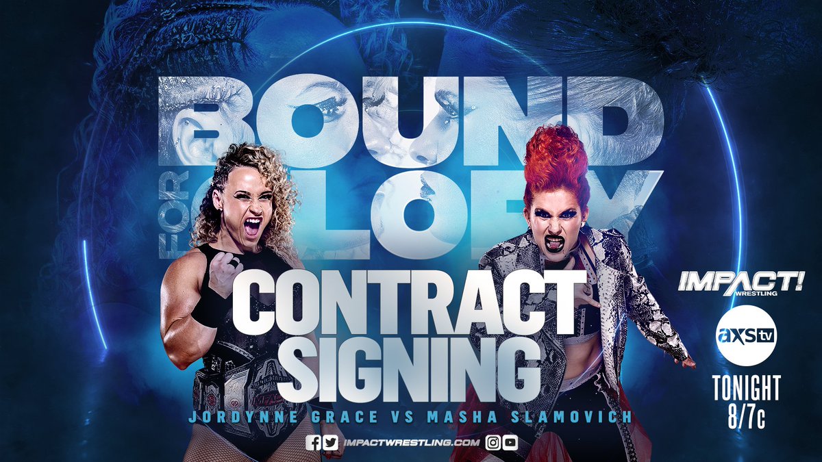 IMPACT Executive Vice President Scott D’Amore facilitates the contract signing for the Knockouts World Championship match between Jordynne Grace and Masha Slamovich at Bound For Glory. The champion and challenger make their way to the ring and sit across from each other at the table. When asked to deliver a final address, Slamovich remains silent and signs the contract. Grace does have something to say, however, and tells Slamovich that while she may be undefeated, she’s not a two-time Knockouts World Champion, former Knockouts World Tag Team Champion and first-ever Digital Media Champion. That makes Grace the first Knockout ever to become a Triple Crown Champion. Grace says that Slamovich has never had the opportunity to learn from losing and at Bound For Glory, she’s going to teach her that difficult lesson. Slamovich utters “Masha’s going to kill you” in Russian before flipping the table on top of Grace. Slamovich Snowplows Grace through the table and stands tall to end the show.