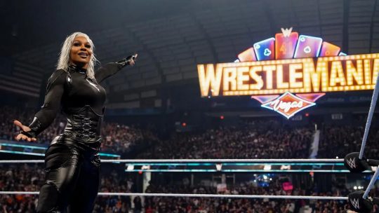 Morgan hits Rousey with a chair and wedges it in the corner. They botch the spot when the chair falls out of the ring. Morgan goes to catapult her into the corner without the chair there, but that’s botched. They do it again, and Rousey hits the ring post. Morgan covers for a two-count. Morgan grabs the chair from ringside and beats Rousey down with it in the ring. Morgan hits a Codebreaker with the chair for a near fall. Morgan takes a while to set the table up in the ring and puts Rousey on top of it. Morgan heads to the top rope and crushes Rousey with a senton splash through the table. Morgan covers, but Rousey kicks out. Rousey immediately grabs the arm for an armbar, but Morgan fights it. Morgan lifts her up and slams her onto the wreckage of the table for a near fall. They’re really struggling with this submission attempt. Rousey is choking Morgan out. Morgan’s false eyelash is resting on her cheek. Morgan is smiling as she fades. The referee calls for the bell.