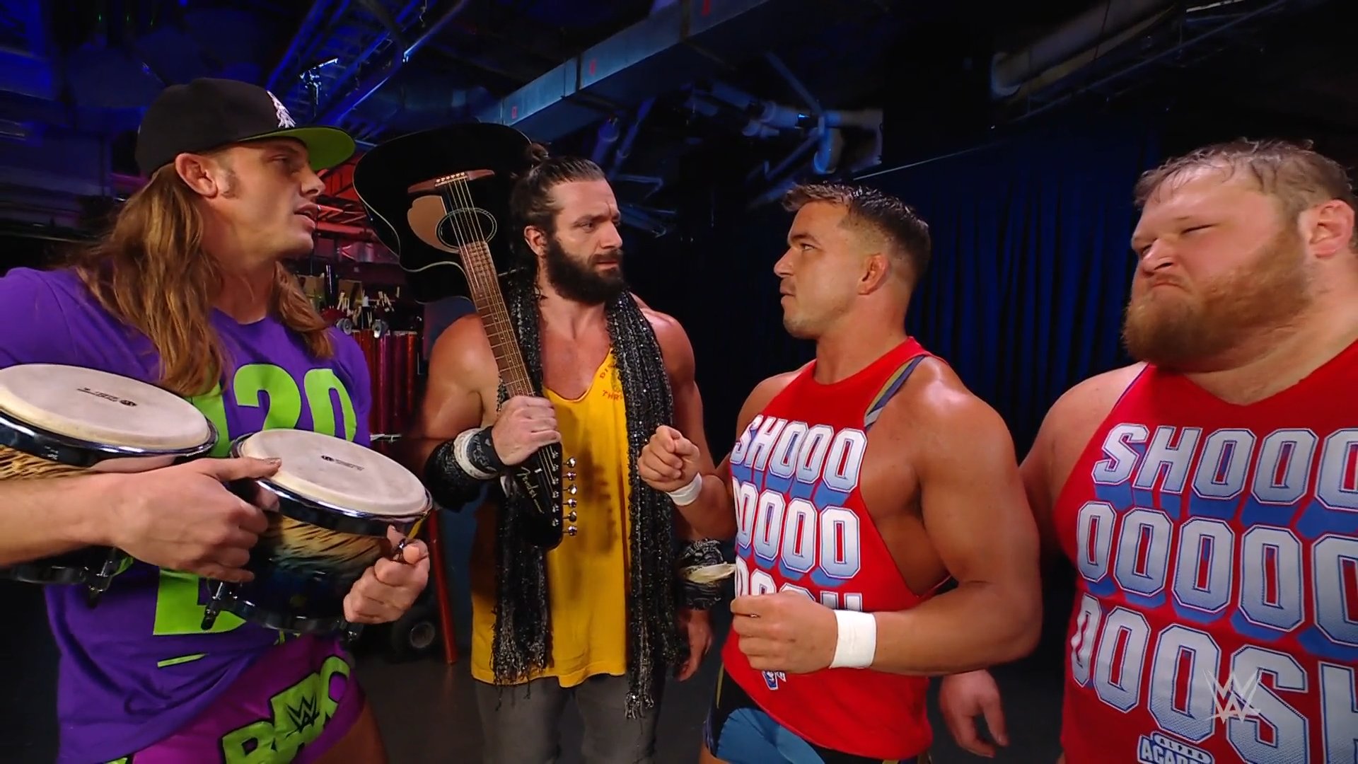 In come Otis and Gable and Gable asks if they are a band. And if they are, they are called Blink 180-shush. Otis says he prefers if Elias would shave his beard and pretend to be his brother. Elias says he and Riddle are not a team and he just got interrupted. He challenges Otis and tells him to find out why WWE stands for Walk with Elias. He says Otis eats pieces of crap like him for breakfast. Riddle says Otis eats pieces of crap for breakfast. A line from Happy Gilmore.