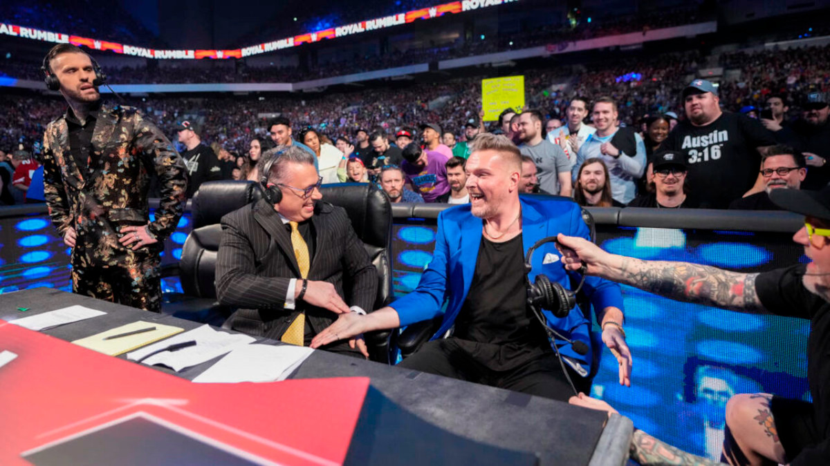 I legit didn’t know if we would ever see you again in the WWE. We talked back in September and you’d be back after football season, a lot in your life has changed since then, a lot in our company has changed since then. I legit didn’t know if you were ever going to be back. If you notice, I haven’t said much to anyone publicly about when you were coming because no one knew. When I sat down that day, Corey (Graves) and I prepared as a two-man booth like we always do, and when the music hit, when I think of Pat McAfee, I think of the White Stripes. When the first couple of bars of the new song hit, I didn’t immediately recognize it. Then Hunter [Triple H] was in my ear, ‘Are you going to sell it?’ I mouthed to him in the spy cam, ‘Sell what?’ Then I looked up and saw your video board and I’m like, ‘You’re ribbing me.’ The music hit and you came out, I didn’t know what to say because I didn’t know if you were coming out to be an announcer or to be the number one entry in the Rumble because we were starting with the Rumble match. Then I saw you in your blazer and I was like, ‘He’s coming out to be an announcer.’ I was so excited.”