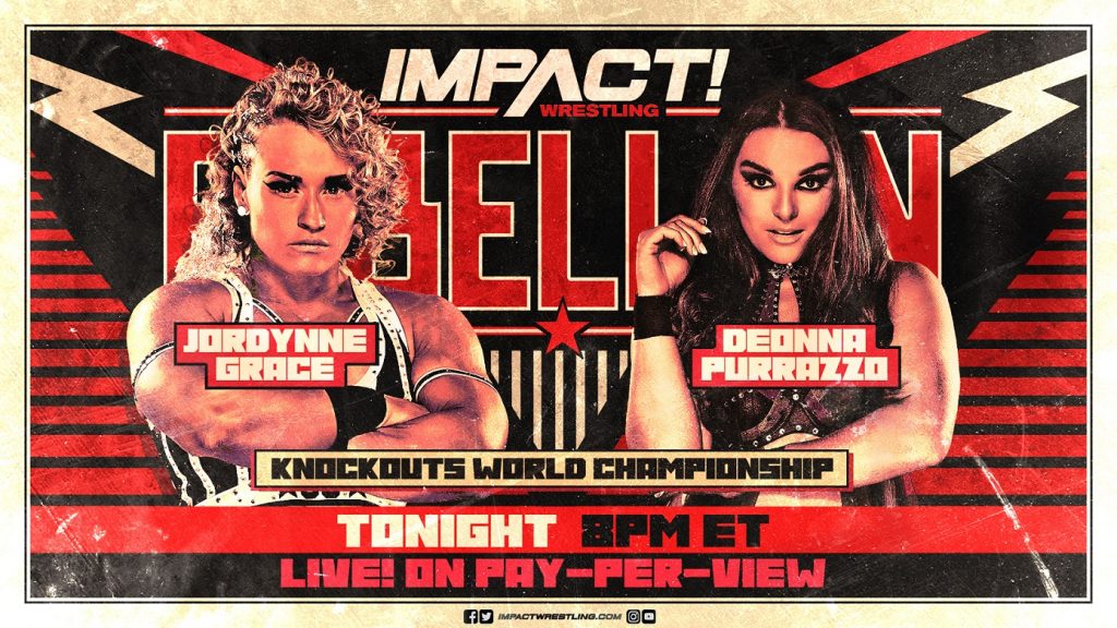 - Vacant Impact Knockouts World Championship – Deonna Purrazzo defeated Jordynne Grace via Queen’s Gambit (pinfall)