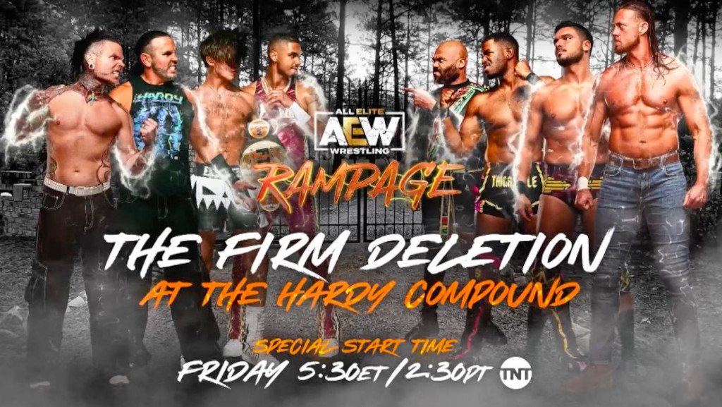 - Friday’s AEW Rampage show in Sunrise, Florida featured the official announcement of The Firm Deletion match between The Firm and The Hardys, Isiah Kassidy, & HOOK at the Hardy Compound will be taking place at next week’s Rampage show.