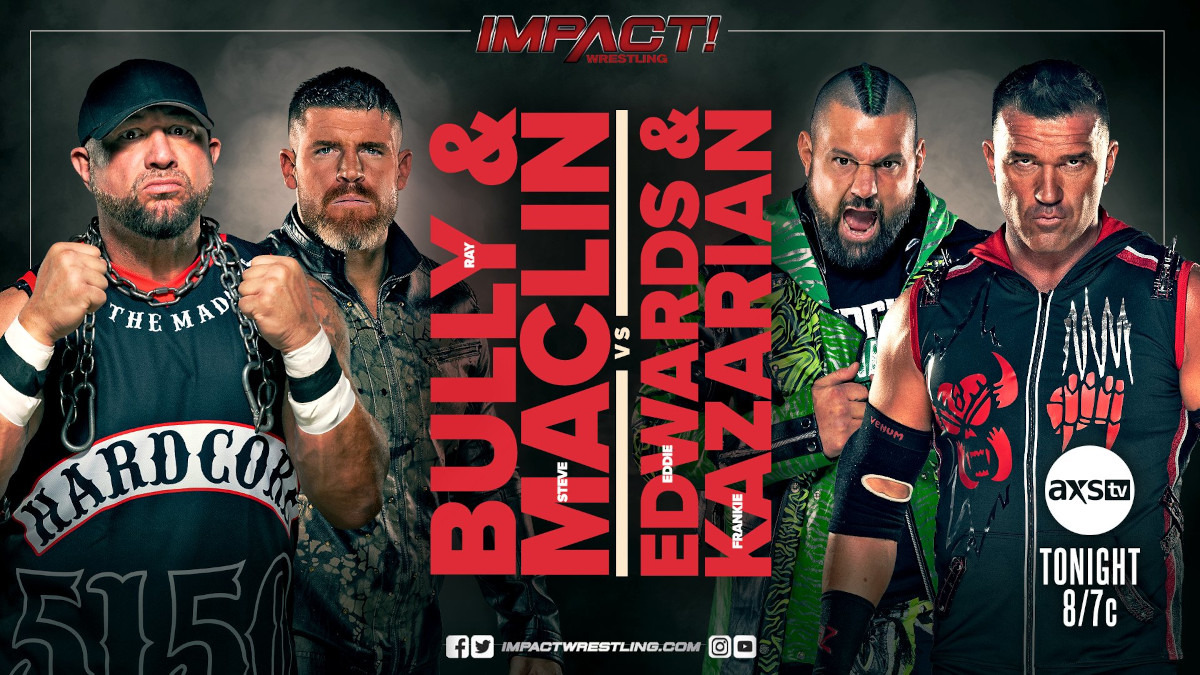 Bully Ray and Steve Maclin tune-up for Slammiversary as they battle enemies turned allies, Eddie Edwards and Frankie Kazarian! Maclin provides a distraction for the referee, allowing Bully to go low on Kazarian with the steel ring post. Edwards and Kazarian are working well together as they hit a combo Atomic Drop-Russian leg sweep on Maclin. Edwards and Kazarian turn their attention to Bully with a double vertical suplex. Edwards dives through the ropes to take out Bully on the floor. Kazarian is next to fly as he hits Maclin with a Hurricanrana on the floor. Bully targets Alisha at ringside, allowing Maclin to gain control off the distraction. Bully and Maclin cut off the ring and prevent Edwards from making the tag. Edwards eventually creates separation after he and Maclin collide with running crossbodies. Edwards makes the tag to Kazarian who enters the match with a burst of speed. Kazarian hits Maclin with the springboard leg drop for two. Kazarian spikes Maclin with a Piledriver but Bully breaks the pin attempt. Bully sends Edwards crashing into his own partner. Edwards inadvertently superkicks Kazarian after Maclin ducks the incoming assault. Bully and Maclin connect with double team offense on Kazarian for three.