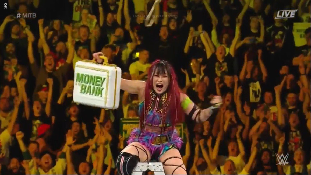 In regards to the Women’s Money in the Bank Ladder match, the finish to this match involved SKY handcuffing both Bayley and Becky’s arms through the upright ladder to prevent them from climbing up. SKY then climbed over Bayley and unhooked the briefcase to become this year’s Women’s Money in the Bank holder. This was SKY’s revenge for Bayley tipping over the ladder she was on earlier in the match during her attempt at grabbing the briefcase.