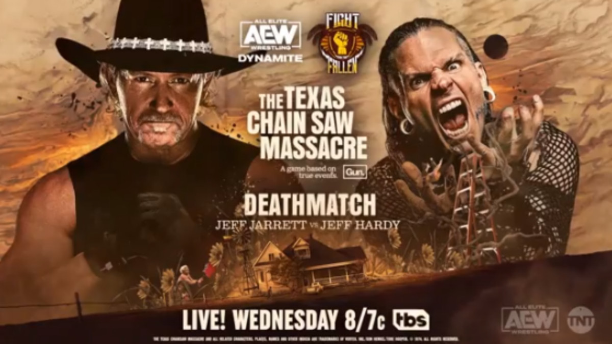 Wednesday’s AEW Dynamite show in Nashville, Tennessee featured a Texas Chainsaw Massacre Deathmatch between Jeff Jarrett and Jeff Hardy that was sponsored by the Texas Chainsaw Massacre video game. Wednesday’s show was also a Fight For The Fallen 2023 special to help raise funds to assist those affected by the recent wildfires in Maui, Hawaii.