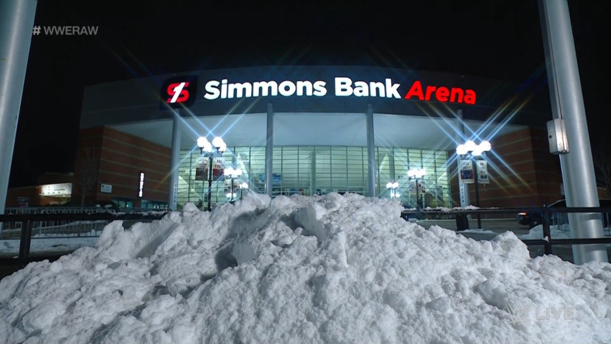 In a separate report, Mike Johnson reported that besides weather-related travel issues, another reason why WWE went with a smaller house show style production setup for this past Monday’s show was due to safety issues involving host venue The Simmons Bank Arena. Johnson reported that his sources stated that the venue was not structured in a way that could support WWE’s current lighting rigs for their shows due to safety concerns over the amount of snow sitting atop the roof. This reportedly prevented WWE from being able to hang their usual lighting rigs from the ceiling and caused them to utilize a lighting truss that was supported by towers erected from the ground up instead. This same issue reportedly was also the reason for the smaller stage and pyro setups for the show.