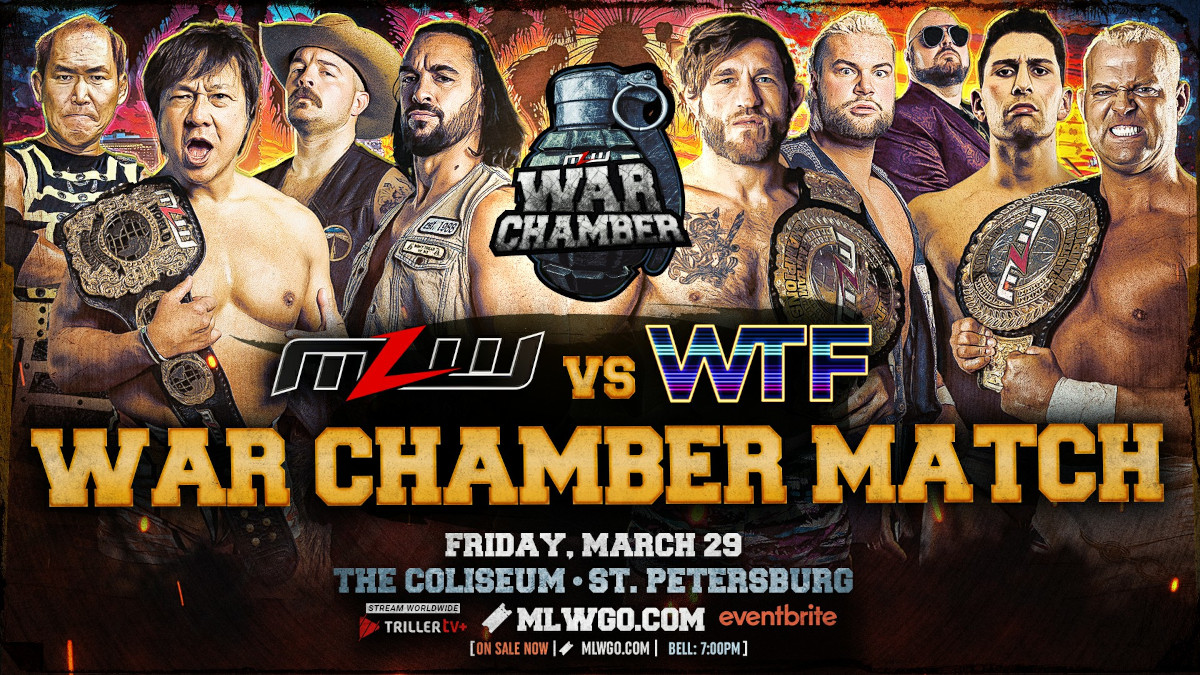 MLW today announced a 2-ring War Chamber match: Team MLW (Satoshi Kojima, Matthew Justice, 1 Called Manders and Okumura) vs. World Titan Federation Superstars® (Tom Lawlor, Davey Boy Smith Jr., Richard Holliday and Josh Bishop) at MLW WAR CHAMBER, live on TrillerTV+ from the Coliseum in St. Petersburg, FL on Friday, March 29.